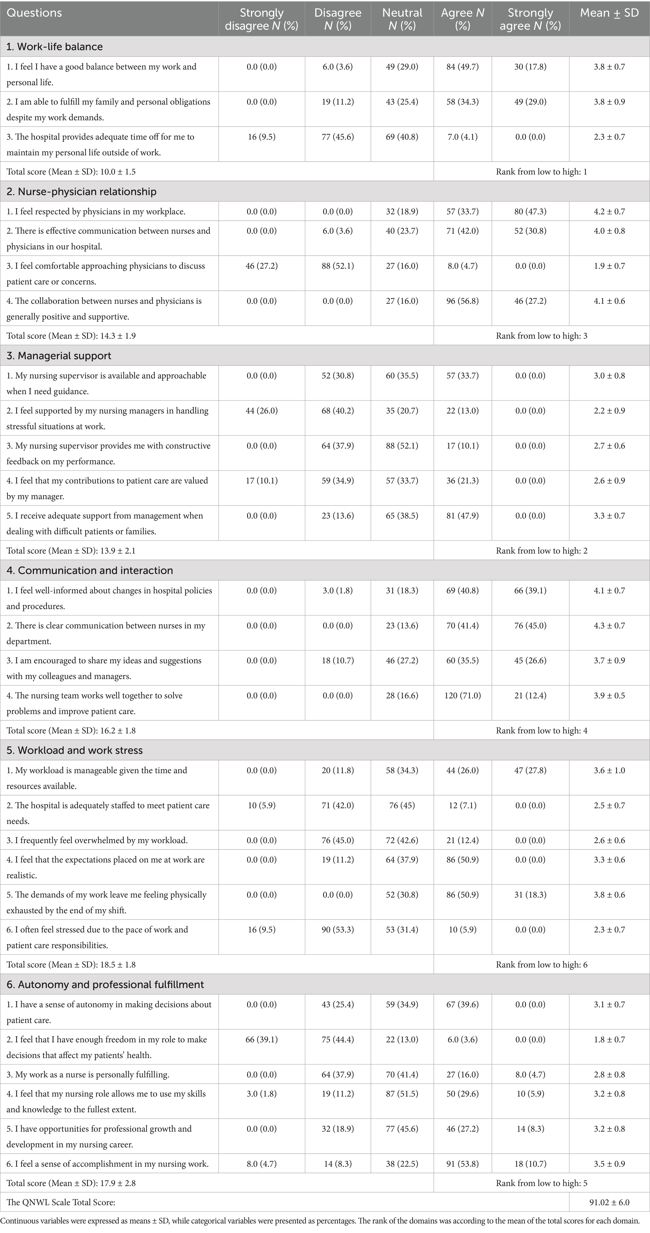 The QNWL survey results showed that nurses at Alsalam and Al Haram hospitals had a mean total score of 91.02 ± 6.0, reflecting a generally poor quality of work life. The domain scores ranked from lowest to highest were: (1) work-life balance, (2) managerial support, (3) nurse-physician relationship, (4) communication and interaction, (5) autonomy and professional fulfillment, and (6) workload and work stress. These results point to critical areas requiring improvement, with work-life balance and managerial support as the top priorities. Subsequent efforts should focus on enhancing nurse-physician relationships, communication, autonomy, professional fulfillment, and reducing workload and work-related stress (Table 4).