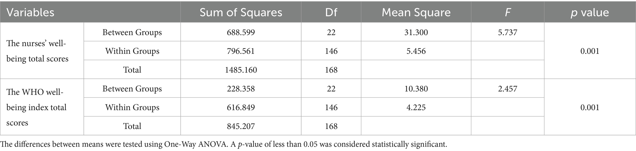 Table 6. The nurses’ well-being total scores, the WHO well-being index total scores, and the quality of nursing work life survey total scores by hospitals, (n = 169).