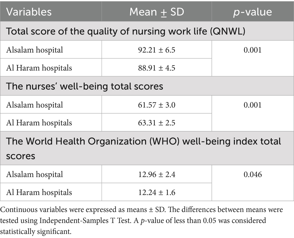 Table 6 illustrates that nurses at Alsalam Hospital scored higher on the total QNWL Scale and the WHO Well-Being Index but had lower total scores on the Nurses’ Well-Being Assessment Tool compared to nurses at Al Haram Hospital. Additionally, statistically significant differences were observed between the two hospitals in both the WHO Well-Being Index and QNWL survey total scores (p-values < 0.05).