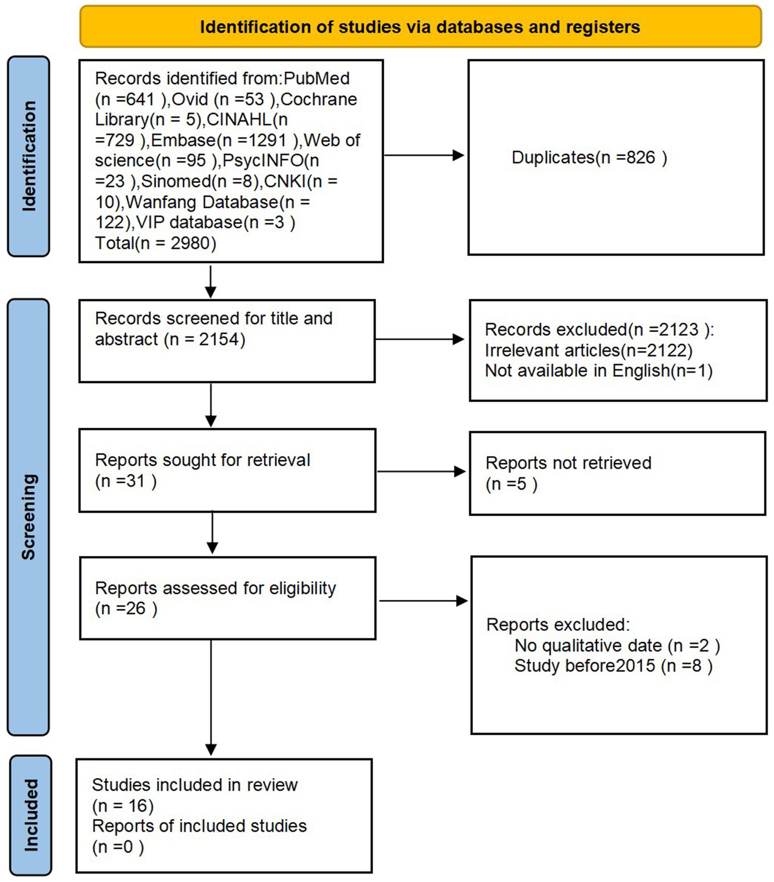 Methods: We systematically searched PubMed, Cochrane Library, Web of Science, CINAHL, PsycINFO, Embase, CNKI, Wanfang Database, VIP Database, China Biomedical Literature Service System to involve relevant literature on the experience and needs of intimate relationship violence among perinatal women. The search period was from the establishment of the database to July 2025. An initial search using the keywords “intimate partner violence,” “pregnancy,” “perinatal,” and “qualitative research” retrieved 2,980 articles. We used JBI quality evaluation criteria to assess the quality of the included studies. This study followed the Enhancing transparency in reporting the synthesis of qualitative research (ENTREQ) guidelines.