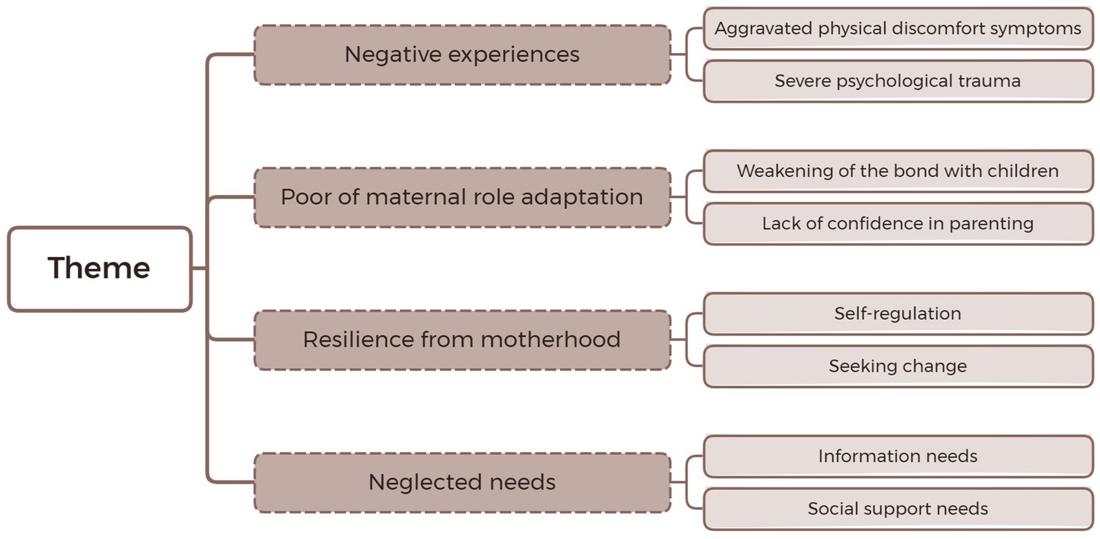 Thematic analysis of 56 key quotes from the 16 included studies generated four overarching themes: Theme 1: Negative experiences (① aggravated physical discomfort symptoms, ② severe psychological trauma); Theme 2: Poor of maternal role adaptation (① Weakening of the bond with children, ② Lack of confidence in parenting), Theme 3: Resilience from motherhood (① Self-regulation, ② Seeking change); Theme 4: Neglected needs (① Information needs, ② Social support needs). A chart was created to summarize the main themes and their interrelationships (Figure 2).