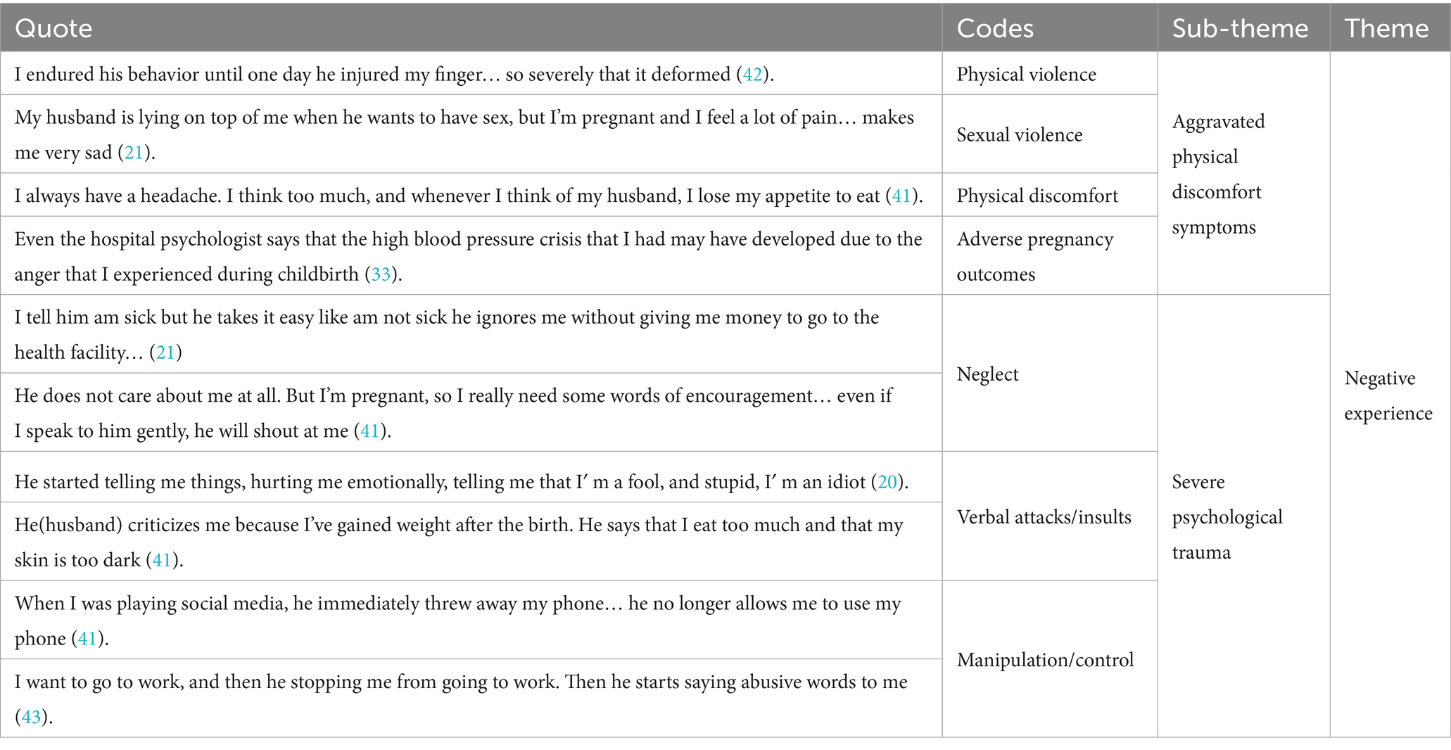 There were various forms of IPV, among which the most serious and harmful was physical violence, which caused irreversible physical and mental trauma to women during the perinatal period (33, 37). Forms of physical violence include slapping, pushing, pulling, kicking, stepping, etc. (21), which leaved serious bruises on women and pose a serious threat to the safety of women and/or fetuses (42, 44). Sexual violence was also one of the important reasons for exacerbating women’s physical discomfort (21). The decrease in women’s willingness to engage in sexual activity during the perinatal period made it a high-risk period for sexual violence (21). Some women expressed that they were often forced or uncomfortable to have sexual intercourse with their husbands (21). Due to long-term stress, many perinatal women who suffered from IPV experience varying degrees of physical discomfort symptoms, such as headaches, insufficient or excessive sleep, nightmares, and decreased attention (40, 41). Physical violence leads to serious adverse pregnancy outcomes such as miscarriage, complications of pregnancy, fetal loss, and maternal deaths (20).