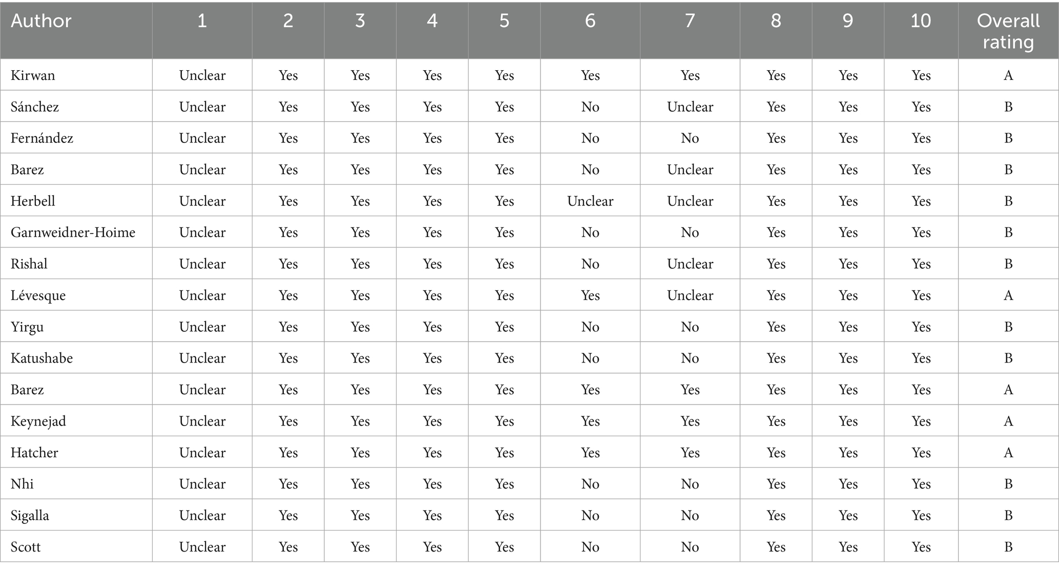 Two researchers conducted literature quality evaluations separately, and if the evaluation results were inconsistent, a third researcher made a decision. The qualitative research quality evaluation criteria published by the Australian JBI Evidence based Healthcare Center were adopted (31). The evaluation consists of 10 items, each evaluated as “yes,” “no,” “not applicable,” or “unclear.” The literature quality is divided into three levels: A, B, and C. Fully meet the evaluation criteria, with a low possibility of bias, rated as Class A; Partially meets the evaluation criteria, with a moderate possibility of deviation, classified as level B; Completely unsatisfied, with a high possibility of offset, classified as level C. The final inclusion of studies with quality evaluation levels of A and B.