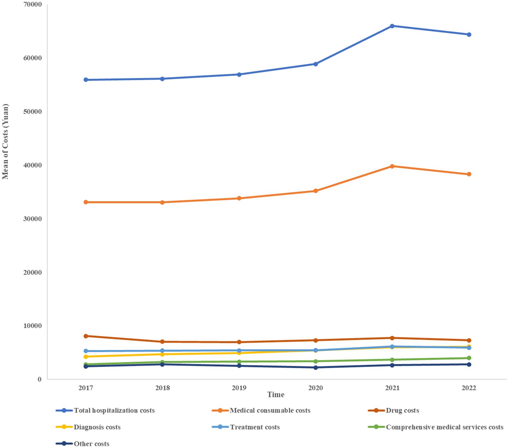 The total hospitalization costs included medical consumables (such as disposable medical fees for examinations, surgeries, and treatments), drugs (including antibiotics and other drugs), treatment (covering surgical and non-surgical procedures), diagnosis (encompassing pathology, laboratory, imaging, and clinical diagnosis), comprehensive medical services (consists of general medical services costs general treatment operation fees, nursing fees, and other charges), and other costs (containing rehabilitation, traditional Chinese medicine, blood and blood products fees, and additional charges). The hospitalization costs in this study were adjusted to 2022 constant prices based on the Consumer Price Index for Healthcare in Shanghai.