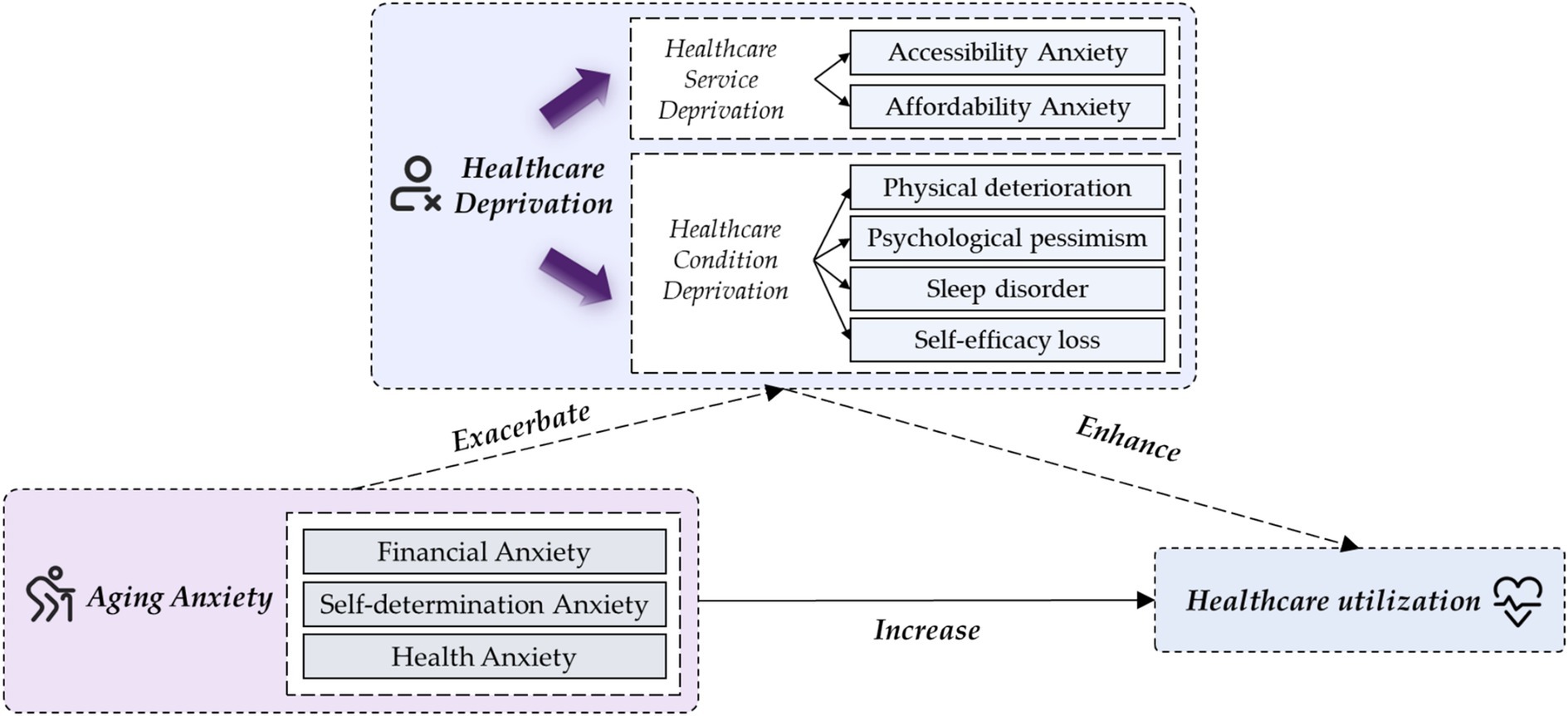 Healthcare utilization, the frequency and nature of people’s engagement with medical services, serves as a vital indicator of health system responsiveness and population well-being (10). Research finds a negative link between aging anxiety and physical symptoms, with self-perceived health acting as a mediator that influences healthcare and public service utilization (11). Health behaviors (12) and anxiety (9) also play a role in healthcare utilization. Understanding the factors that influence healthcare utilization is essential, as it directly affects disease prevention, early diagnosis (13), treatment adherence, and health outcomes (14). In the context of aging populations, clarifying how aging anxiety impacts healthcare utilization is particularly important. It informs whether anxiety leads to timely, appropriate medical care or whether it results in either overuse or underuse of services, both of which have significant implications for individual health and healthcare system sustainability. Additionally, the concept of healthcare deprivation highlights the multifaceted barriers, both structural and psychological, that modify the relationship between aging anxiety and healthcare utilization (15). Healthcare deprivation can be described as the situation where individuals do not have access to medical services when needed (16). Given the demographic trends worldwide, investigating the pathways from aging anxiety to healthcare utilization is crucial for designing effective, equitable health policies.