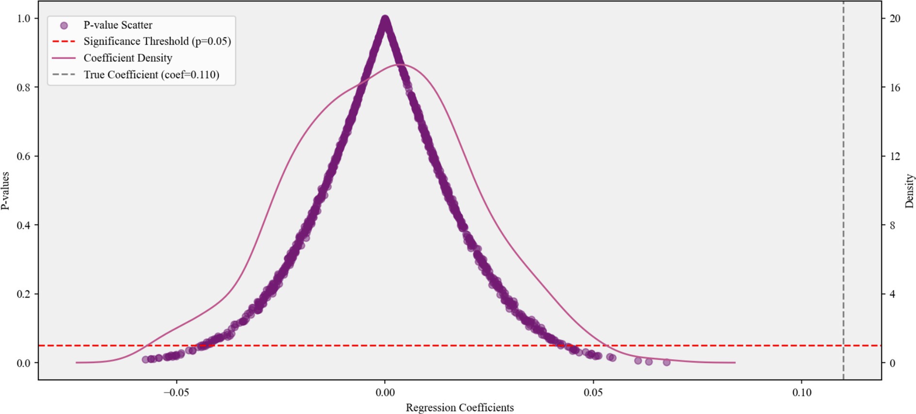 Simultaneously, we also performed a placebo test by randomly generating pseudo-treatment groups through 1,000 Monte Carlo permutations. In Figure 2, the pseudo-treatment groups’ coefficients are predominantly centered around 0, with their estimated p-values mostly exceeding 0.05. A distinct separation between placebo effects and the actual coefficient value (0.110) is also obvious in kernel density estimation. We find no evidence of random-grouping bias, and the result of baseline regression is almost impossible to originate from random variations.