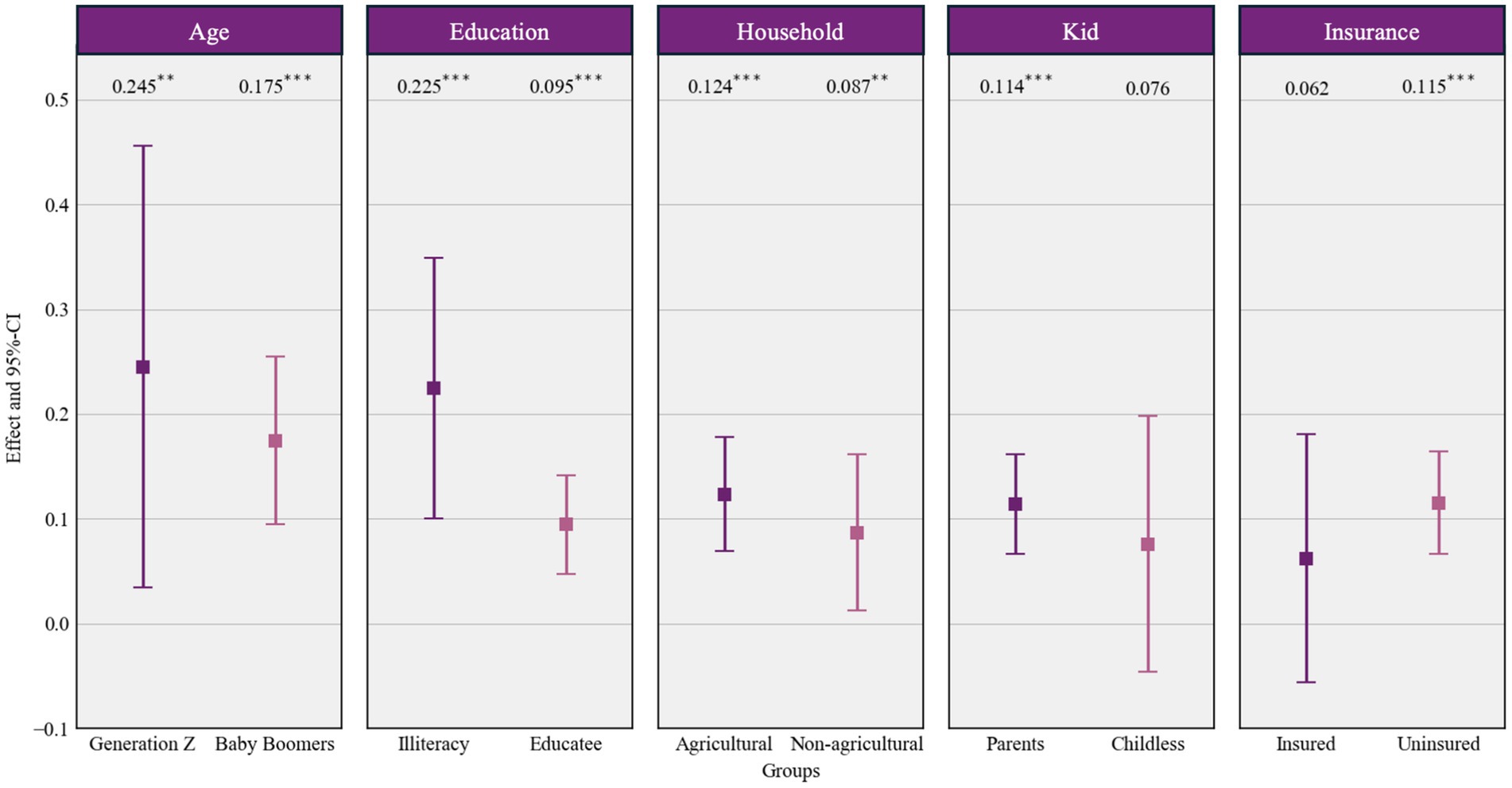 To assess variability in effects across population subgroups, we conducted a heterogeneity analysis. Figure 3 visually summarized the results through forest plots comparing effect sizes and 95% confidence intervals (CIs) across five socio-demographic categories.