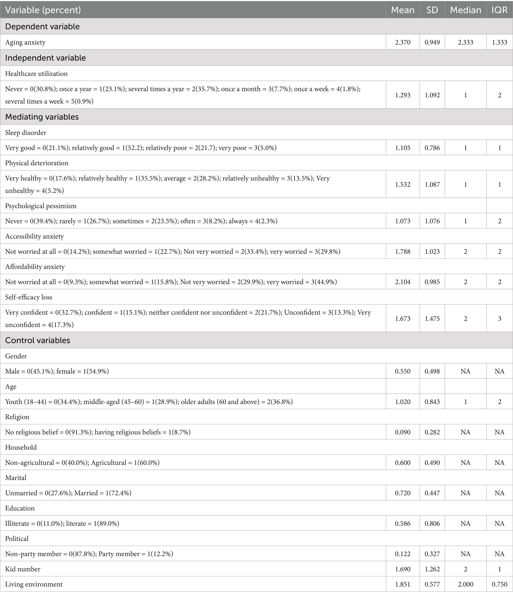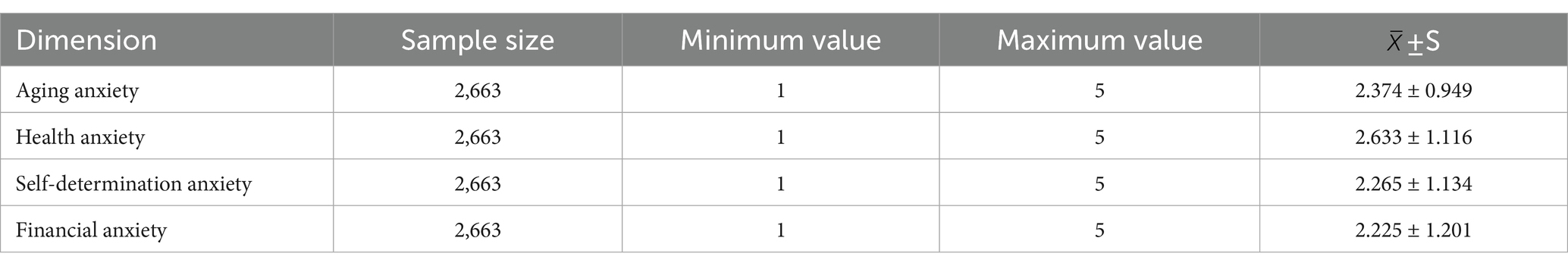 The descriptive statistics for the key variables in this study are summarized in Tables 1, 2. Table 1 presents the aging anxiety status across three dimensions. The mean score for aging anxiety was 2.374 (SD = 0.949), suggesting moderate levels of anxiety regarding aging-related concerns. This overall score is influenced by four key dimensions: health anxiety, which had a mean score of 2.633 (SD = 1.116), reflecting moderate concern about health issues; self-determination anxiety, with a mean of 2.265 (SD = 1.134), indicating concerns about personal autonomy; and financial anxiety, which scored a mean of 2.225 (SD = 1.201), showing moderate anxiety about financial stability (Table 1). Healthcare utilization was measured using a six-category ordinal scale, with 30.8% of respondents indicating no healthcare visits in the past year, and 35.7% reporting seeking care several times a year. For health-related perceptions, 52.2% of participants rated their sleep quality as relatively good, while 35.5% considered themselves to be physically healthy. In terms of psycho-logical well-being, 39.4% of respondents reported no feelings of depression, with 5.2% indicating severe physical deterioration. Significant levels of accessibility anxiety and affordability anxiety were observed, with substantial proportions of the population expressing concerns about healthcare access and the affordability of medical services. Self-efficacy loss in managing healthcare-related tasks was reported by 17.3% of individuals as being very unconfident (Table 2).
