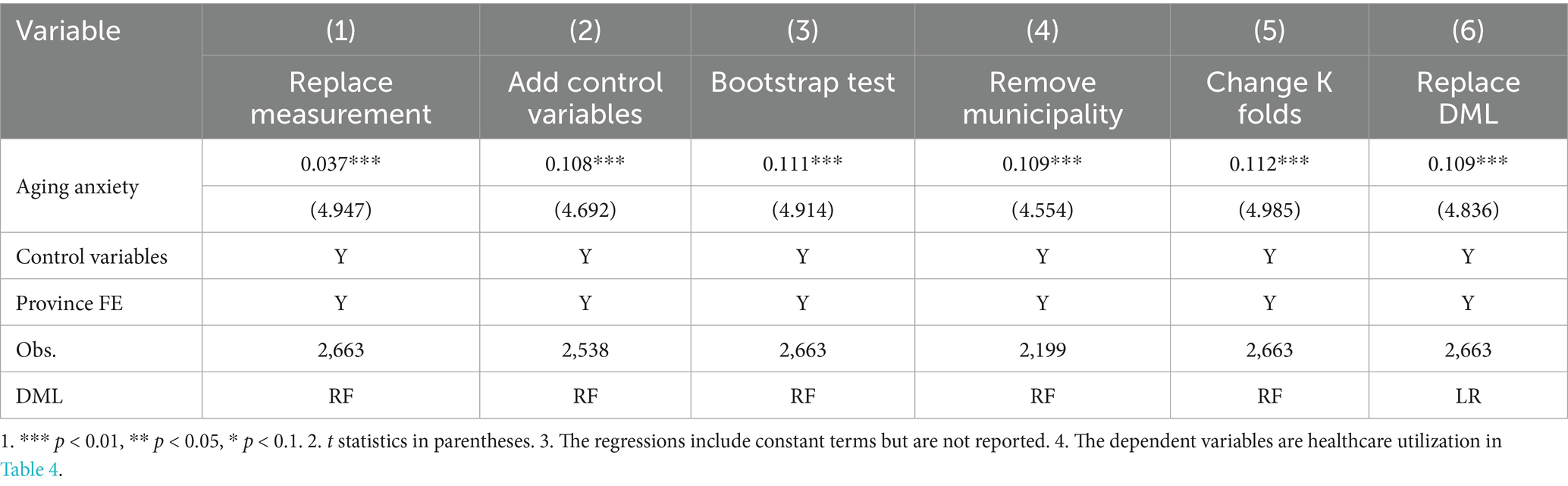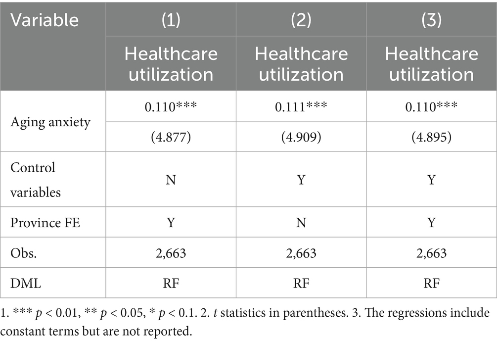 Methods: Based on large-scale data from the 2021 Chinese General Social Survey (CGSS), the study employs a Double Machine Learning (DML) method to build a causal inference model. The random forest algorithm is used to estimate the marginal effect of aging anxiety on healthcare utilization. The robustness checks and placebo tests are conducted to further verify the model’s stability and validity. Finally, heterogeneity analysis explored the differential impact of independent variables across groups by age, education, household health status and kid number.