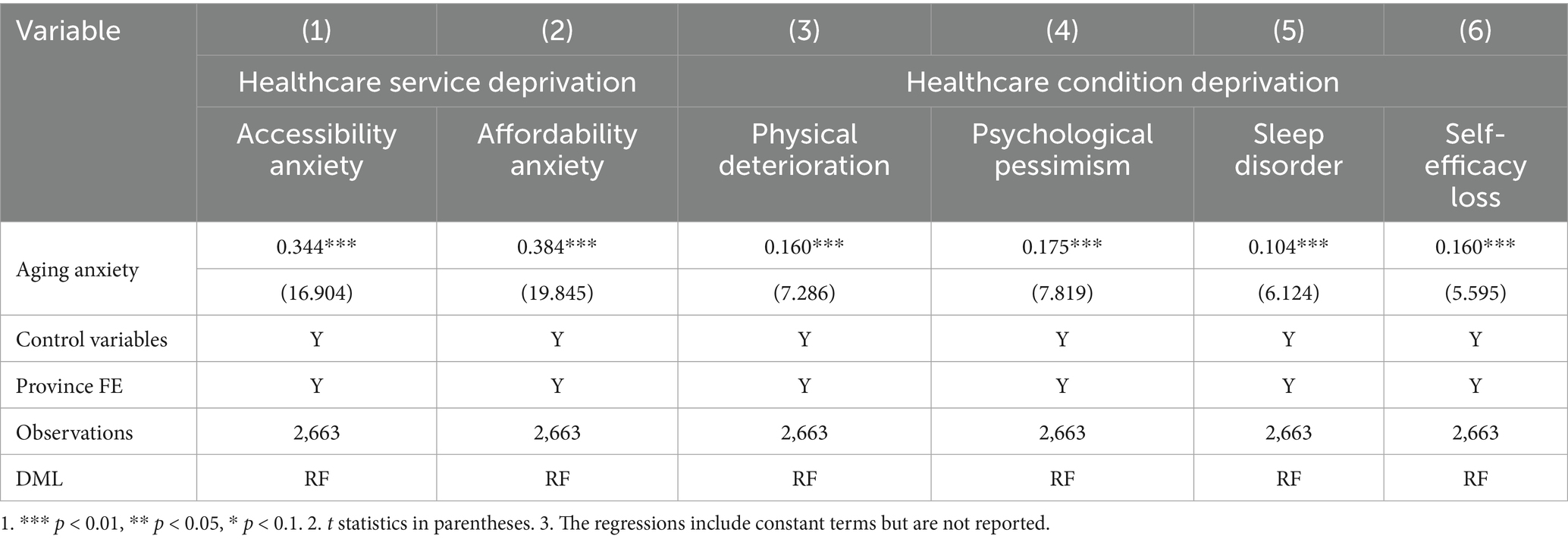All of data analyses were conducted using the Double ML package (version 0.9.3) in Python (version 3.9). The specific parameters are listed in Appendix Tables S6–S9. First, descriptive statistics were performed to examine the distribution situation of the sample. Second, we conducted the causal inference and influencing mechanism analyses through the Double Machine Learning (DML) based on random forest (RF). In our mediation analysis, we utilized the DML framework to estimate the causal pathways, specifically focusing on the mediation effect through identified mediators (28). Control variables and province fixed effect were added to further address potential confounders and omitted variable bias. Furthermore, a series of robustness tests were conducted to assess the stability of the impact of aging anxiety on healthcare utilization. A placebo test by randomly generating pseudo-treatment groups through 500 Monte Carlo permutations was also carried out. Third, heterogeneity analyses based on DML models were conducted to examine whether the relationship between aging anxiety and healthcare utilization is different across subgroups defined by other demographic characteristics or health status.