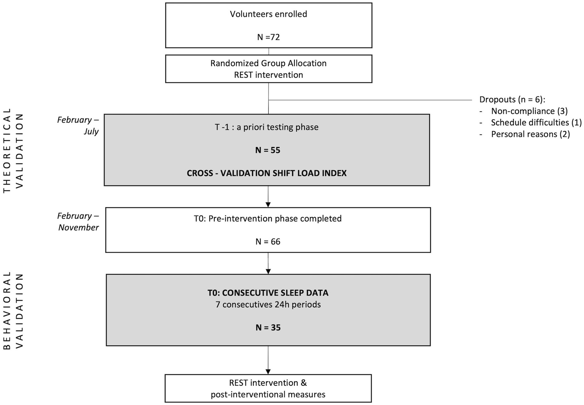 Between February and November 2022, we collected both schedule data and objective sleep data, with shift rosters for SLI computation provided by emergency department and ambulance administration. The study was conducted in 2 phases: In the first phase (February–July 2022), we tested our index in a preliminary group of participants (early-stage subset) by comparing it to established risk measures (theoretical validation). In the second phase, following the completion of participant enrollment in November 2022 (REST protocol), we assessed the index’s relationship with objective sleep data collected at the pre-intervention stage for the full study sample (behavioral validation). Participants completed questionnaires at baseline (study inclusion) and again at the end of the sleep monitoring period. Demographic variables captured included sex, age, BMI, relationship status, presence of young children (≤ 5 years), shift-work experience, and commute time.