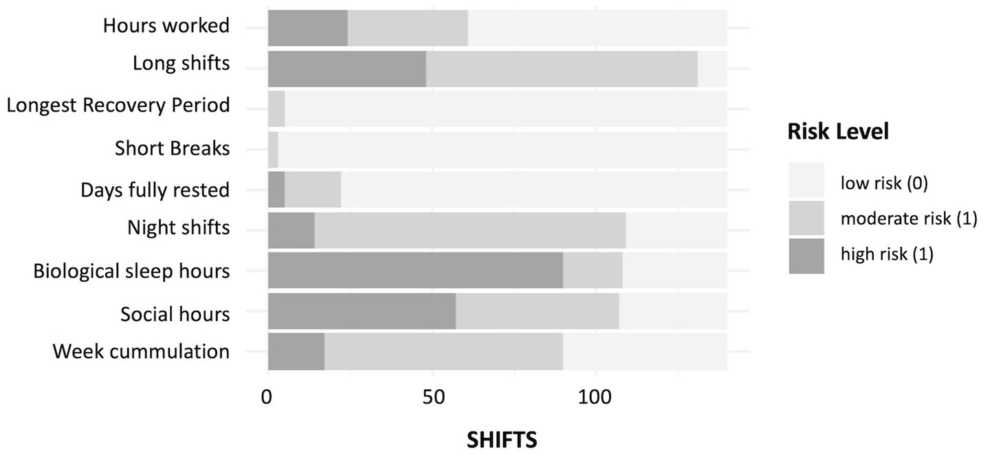 In the theoretical testing phase, schedule analysis included 140 shifts worked by 55 EHPs (Figure 1, flow chart), with each participant providing repeated measures (two to three shifts each). Night shifts accounted for 51% of the shifts. The risk distribution across the extended Shift Load Index (SLI) with its 9 items is illustrated in Figure 2. While most SLI items exhibited varied risk levels, those related to rest opportunities generated minimal risk within this sample.