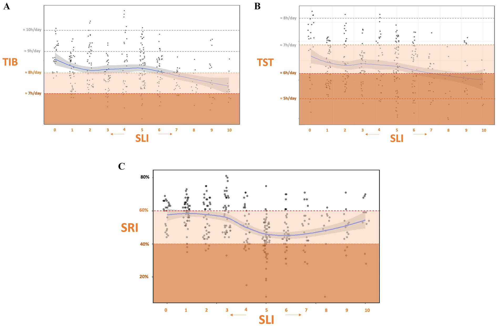 Figure 3. Associations between shift load and sleep measures. (A) Time in bed (TIB) versus Shift Load Index (SLI). (B) Total sleep time (TST) versus SLI. (C) Sleep Regularity Index (SRI) versus SLI. Blue lines show LOESS-smoothed trends. Generalized linear mixed models (controlling for subject) were all significant, indicating that higher SLI predicts reduced sleep quantity and regularity. Subjective zoning overlays guide visual interpretation.