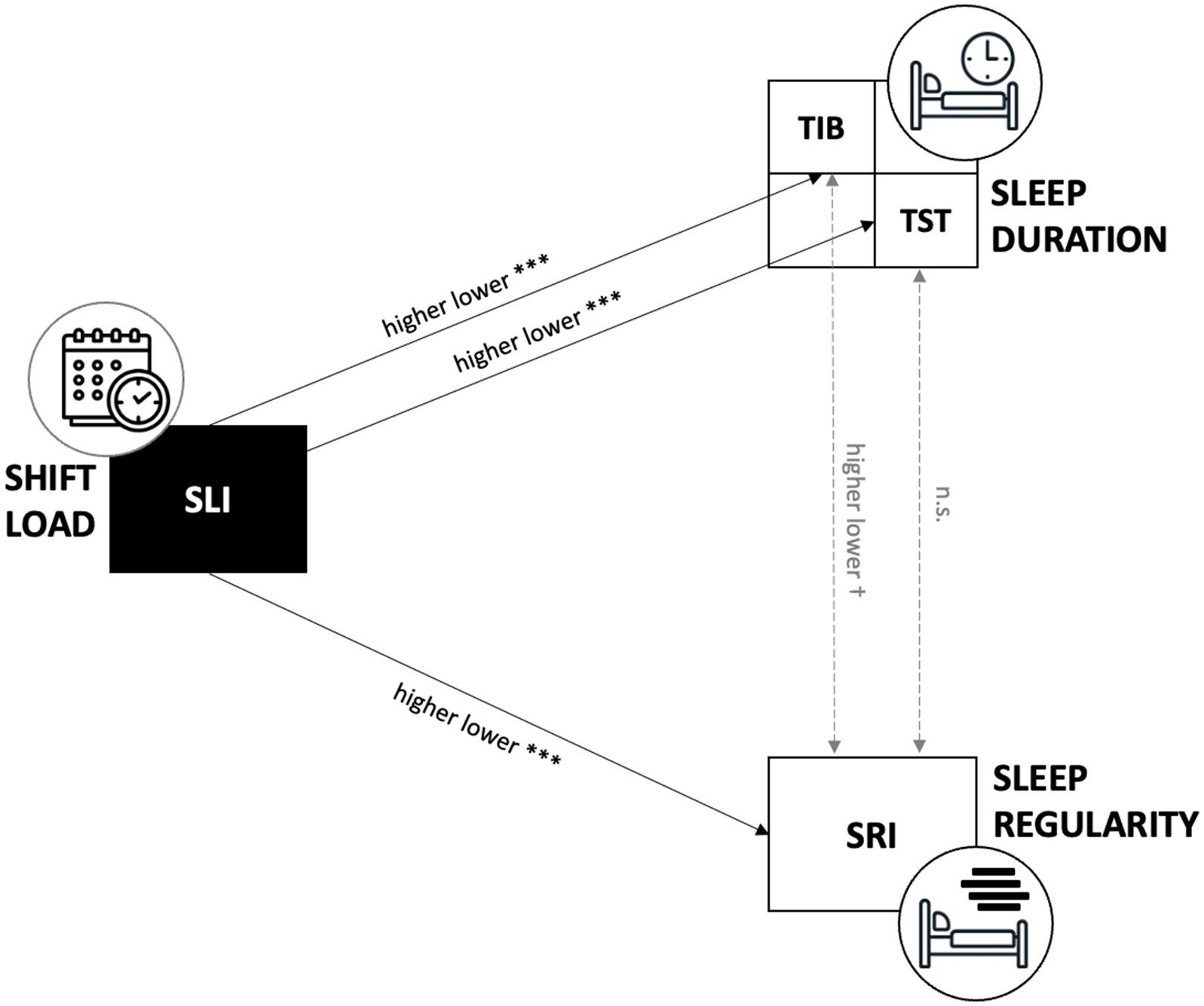 Figure 4. Conceptual model of shift-load effects on sleep. Schematic illustrating significant (solid arrows, *** p < 0.001) and non-significant (dashed arrow) pathways between SLI, TIB, TST, and SRI.