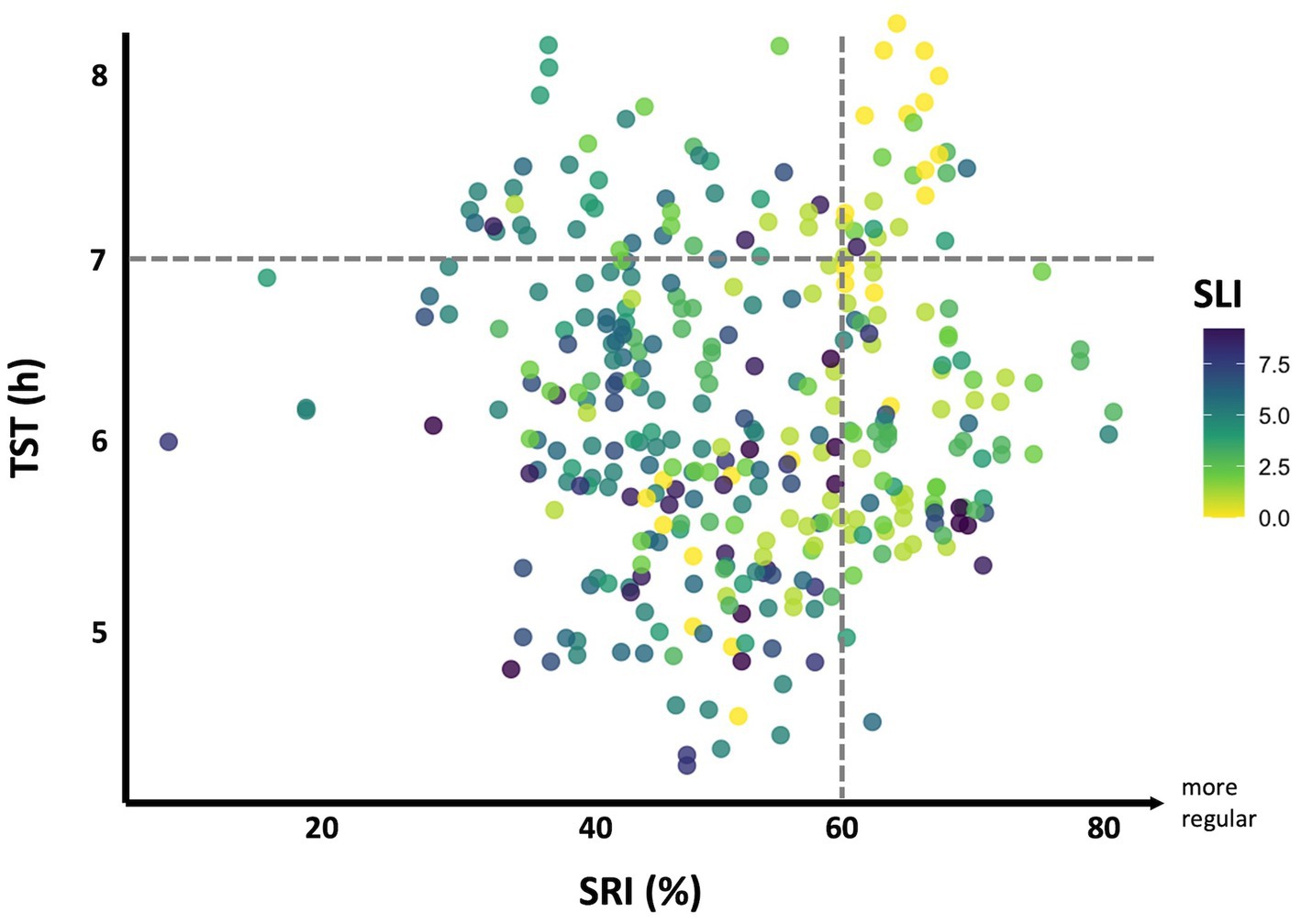 Figure 5. Shift adaptation framework. Scatterplot of SRI (%) versus average TST (h), with points colored by SLI on a Viridis scale (bright yellow = low shift load; dark purple-blue = high shift load). Dashed horizontal line at 7 h denotes the minimum recommended TST (65); dashed vertical line at 60% SRI marks the lowest quintile cutoff (61–64%) from non–shift-working cohorts (13, 30, 31).