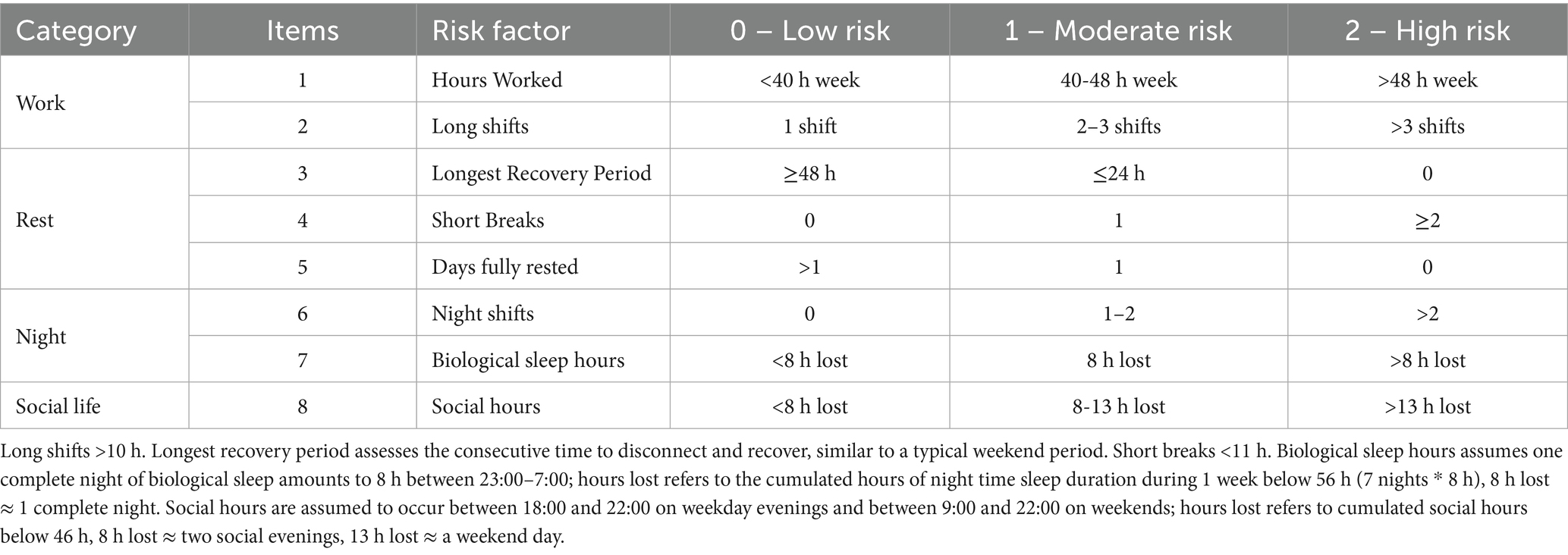 The SLI is a validated predictive scoring system originally developed by Gander et al. (13, 14) to assess, based on planned work schedules, the imposed risk of limited recovery opportunities. For the present study, we adapted the SLI to the French shiftwork system and extended it by including a specific rating for the degree to which work hours conflict with typical social hours (evenings, weekends) recognizing that such conflicts may increase social pressure and further reduce sleep opportunities (27). These adaptations are detailed in a publicly available preprint (28). The SLI score generated for a work schedule of one week comprises 8 items, (Table 1); each with predefined cut-off scores to define 3 different risk levels: 0 (low risk), 1 (medium) or 2 (high). The higher the shift load, the greater the misalignment between work schedules and biological or social rhythms. Accordingly, higher risk levels represent less opportunity for recovery and restorative sleep. The total SLI score (ranging from 0 to 16) is obtained by summing the risk levels across all items. If possible, we also recommend including a ninth item in an extended version of the index to account for cumulative fatigue arising from the previous week. In the theoretical validation phase, the SLI score was computed based on two-week work schedules, allowing the use of the extended version rated on all nine items. In contrast, for the behavioral validation phase, the score was calculated from one-week work schedules to match the available behavioral data, and thus was rated on eight items only. Ratings were generated for each day using a dynamic sliding window approach, whereby each day’s score reflects recovery opportunities within the preceding seven-day period. This method enables a continuous and temporally sensitive assessment of recovery risk.
