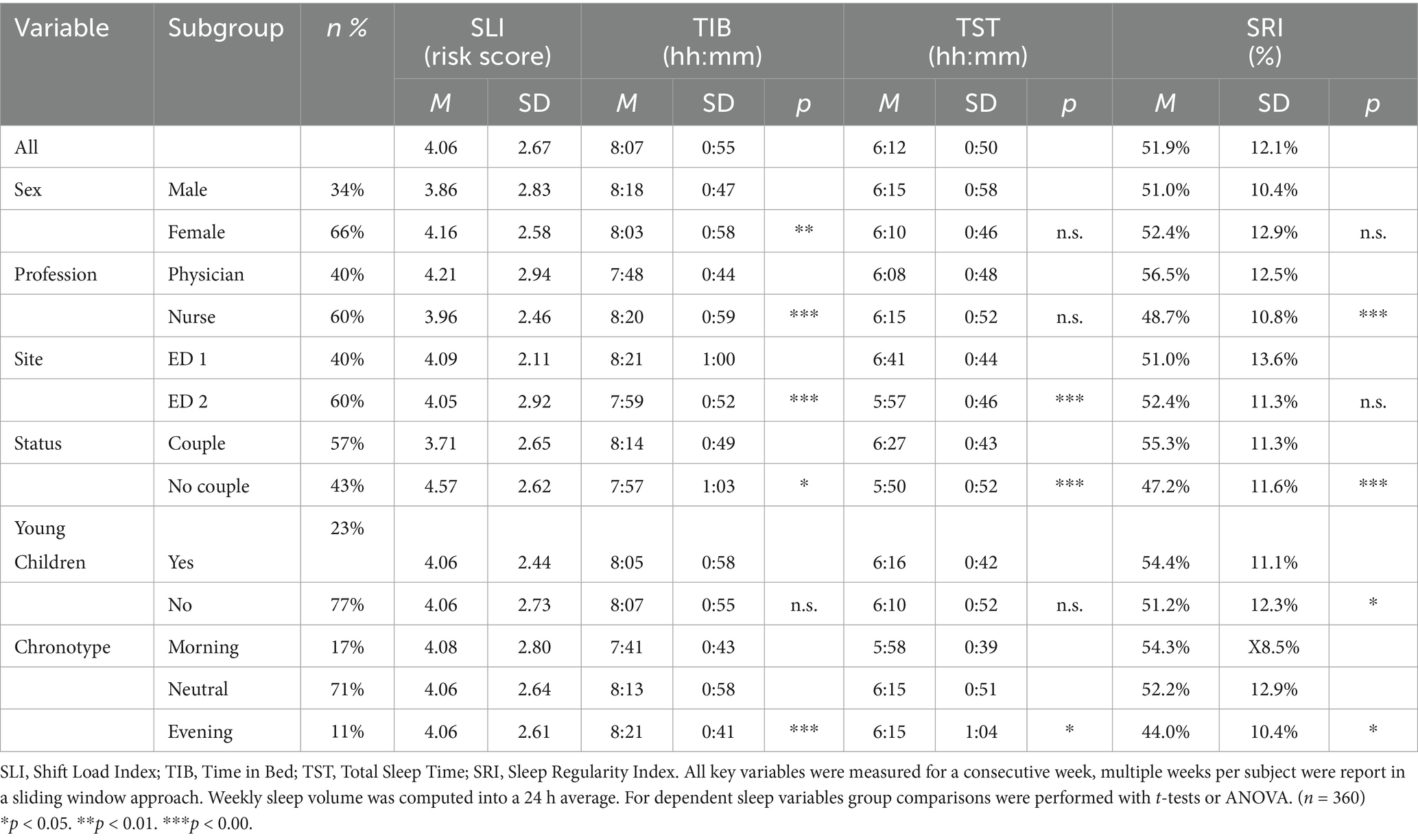 This study investigated the impact of shift load on sleep patterns among emergency healthcare professionals (EHPs), with a particular focus on the role of recovery limitations in predicting sleep duration and regularity. Higher Shift Load Index (SLI) scores, reflecting greater shift-related strain, were significantly associated with shorter sleep duration and reduced sleep regularity, even after accounting for chronotype and shift work experience. These findings underscore the substantial challenges EHPs face in preserving restorative sleep under demanding schedules, contributing to circadian rhythm misalignment and heightened risk of insomnia (35). In our study, EHPs spend approximatively 8 h in bed but effectively sleep for only 6 h underscores the widespread issue of chronic sleep debt among this population. These sleep disturbances have been associated with a spectrum of health issues, such as obesity (36) and an increased susceptibility to mental health disorders (37). Our results underline the critical need for effective management of work- rest cycles in healthcare environments to protect and promote both the well-being of professionals and the safety of patients.