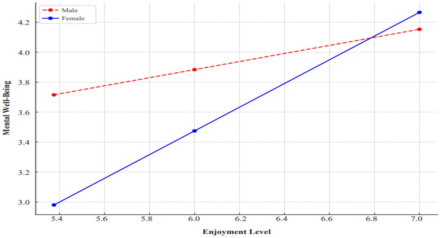 When the analysis results were examined, the regression model testing the relationship between physical activity enjoyment and mental well-being was found to be significant (F = 50.388; p < 0.001), and the model’s explanatory power was 28.0% (R2 = 0.280). The physical activity enjoyment variable was found to have a significant and positive effect on mental well-being (β = 0.2693; p < 0.001). The physical activity enjoyment variable was found to have a significant and positive effect on mental well-being (β = 0.2693; p < 0.001). Furthermore, the main effect of gender on mental well-being was statistically significant (β = −3.5410; p < 0.001). This result indicates that female individuals have lower levels of mental well-being than male individuals. The inclusion of the interaction term (enjoyment × gender) in the model significantly improved the model (ΔR2 = 0.0494; p < 0.001). This result indicates that gender has a moderating effect on the relationship between enjoyment and mental well-being. The regression coefficient for this interaction was also statistically significant (β = 0.5220; p < 0.001). This finding suggests that the effect of enjoyment on mental well-being differs by gender (Table 3).