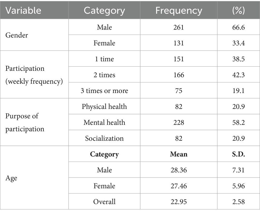 The study sample consisted of individuals who participated in campus recreation activities organized on the Sakarya University of Applied Sciences campus. Participants were students who regularly took part in various campus recreation activities, including outdoor sports, fitness, football, basketball, and tennis. Within the scope of the research, participants were recruited using a convenience sampling method. The inclusion criterion for the study was that individuals had participated in at least one recreational activity organized within the university within the last month. After eliminating incomplete or incorrectly completed forms from a total of 400 individuals, data from 392 participants were included in the study. Of the participants, 261 were male (66.6%) and 131 were female (33.4%). The mean age was 28.36 ± 7.31 for males and 27.46 ± 5.96 for females, while the overall mean age was 22.95 ± 2.58, with the age distribution ranging from 18 to 29. Regarding weekly frequency of participation, 151 students (38.5%) reported attending once per week, 166 students (42.3%) twice per week, and 75 students (19.1%) three or more times per week. In terms of the purpose of participation, 82 students (20.9%) engaged primarily for physical health, 228 (58.2%) for mental health, and 82 (20.9%) for socialization. According to Sekaran (46), when the population exceeds 10,000,000, a minimum of 384 participants is considered sufficient, and sample sizes between 30 and 500 are generally appropriate. Therefore, the inclusion of 392 participants in this study meets these criteria and enhances the statistical power and generalizability of the findings. Descriptive statistics for the participants are given in Table 1.
