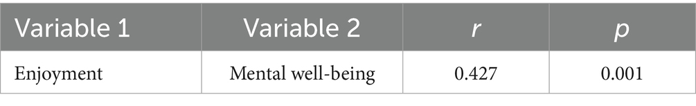 When the analysis results were examined, a moderately positive and statistically significant correlation was identified between physical activity enjoyment and mental well-being (p < 0.01). This outcome indicates that physical activity contributes not only to physical health but also to psychological well-being. A comprehensive meta-analysis by Singh et al. (56) demonstrated that physical activity exerts significant positive effects on depression, anxiety, and psychological stress across diverse populations. In parallel, previous research has consistently shown that physical activity enhances subjective well-being while reducing adverse psychological states such as depression and anxiety (57–59).