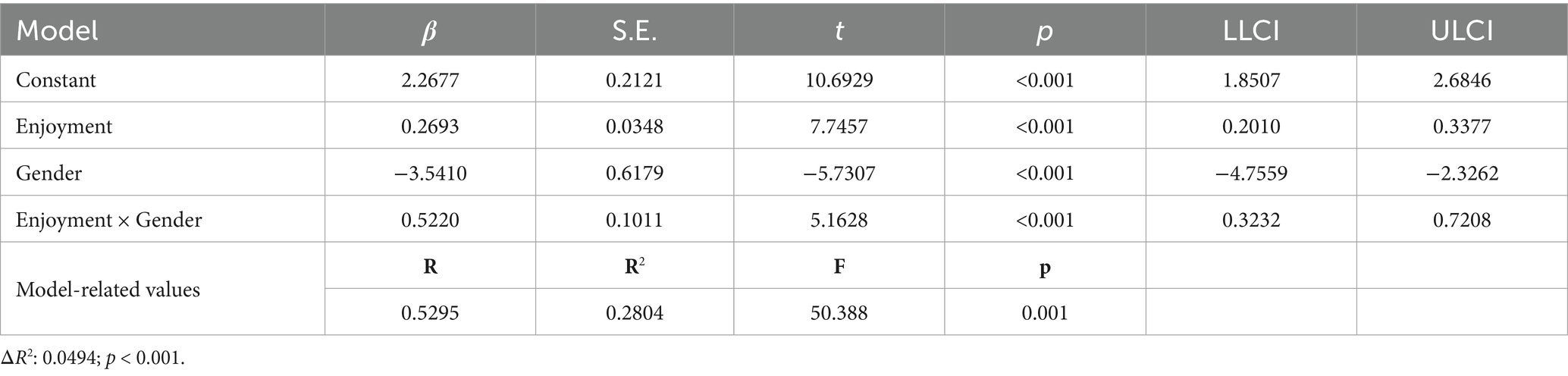 Results: The level of enjoyment of physical activity was found to have a significant positive effect on mental well-being (r = 0.427, p = 0.001; F = 50.388, p < 0.001; R2 = 0.280). Moderation analysis further showed that gender significantly moderated this relationship (ΔR2 = 0.049; p < 0.001). The effect of enjoyment on mental well-being was significant for both males (β = 0.2693; S.E. = 0.0348; p < 0.001; 95% CI [0.2010, 0.3377]) and females (β = 0.7913; S.E. = 0.0949; p < 0.001; 95% CI [0.6047, 0.9780]), with the effect being stronger among females.