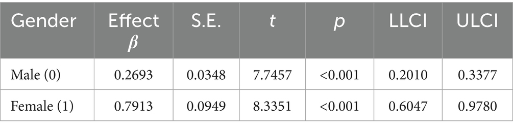 According to the moderation analysis, the effect of physical activity enjoyment on mental well-being differs significantly by gender. The effect of enjoyment on mental well-being was found to be statistically significant in males (β = 0.2693; S.E. = 0.0348; p < 0.001; 95% CI [0.2010; 0.3377]). This effect was higher in females (β = 0.7913; S.E. = 0.0949; p < 0.001; 95% CI [0.6047; 0.9780]) and was significantly higher. These findings suggest that increased enjoyment from physical activity positively impacts mental well-being in both genders, but this effect is stronger in women. Therefore, gender stands out as a moderating factor in the relationship between enjoyment of physical activity and mental well-being (Table 4).