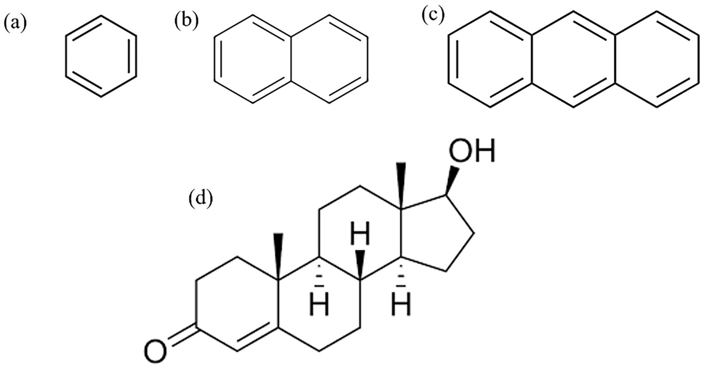 Figure 1. Molecular structures used in calculations: (a) benzene, (b) naphthalene, (c) anthracene, and (d) testosterone.