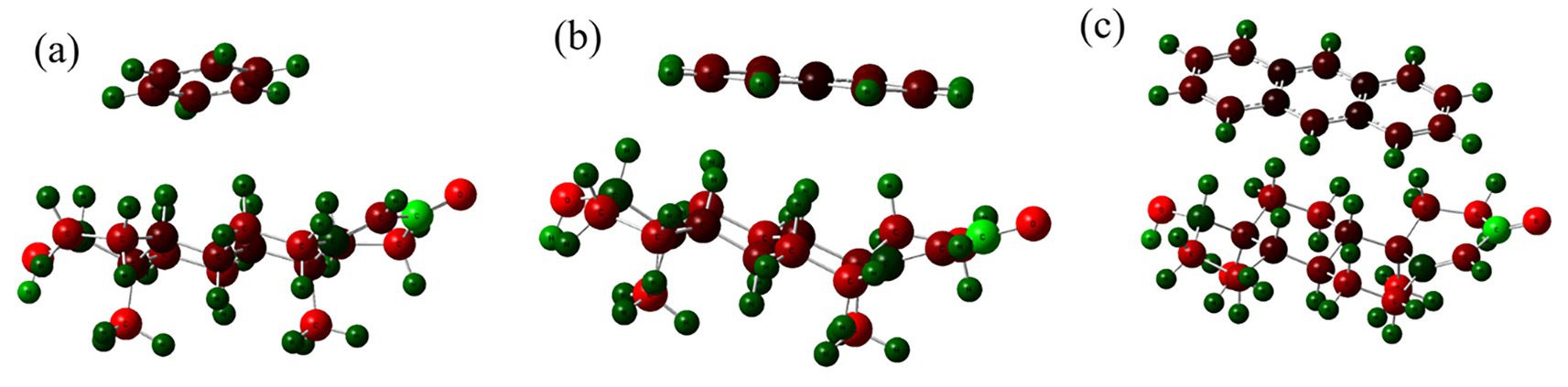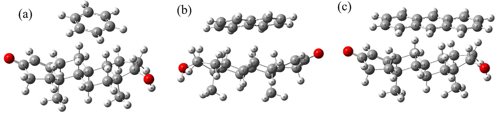 Figure 2 presents the optimized geometries of testosterone complexes with benzene, naphthalene, and anthracene obtained through Density Functional Theory (DFT) calculations. In Figure 2a, benzene forms a weak π–π stacking interaction near testosterone’s D-ring, indicating mild van der Waals interactions. Figure 2b shows naphthalene establishing a parallel displaced stacking configuration, indicating stronger π–π interactions compared to benzene. Anthracene (Figure 2c) exhibits the strongest π–π interaction due to its extended aromatic surface, suggesting the highest binding affinity among the three PAHs.