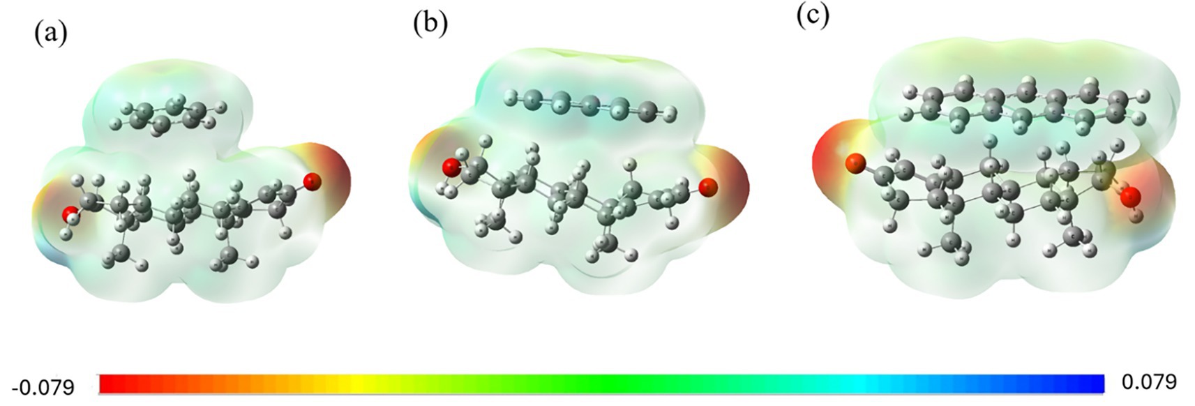 Figure 3. MEP surfaces for testosterone complexes with (a) benzene, (b) naphthalene, and (c) anthracene.