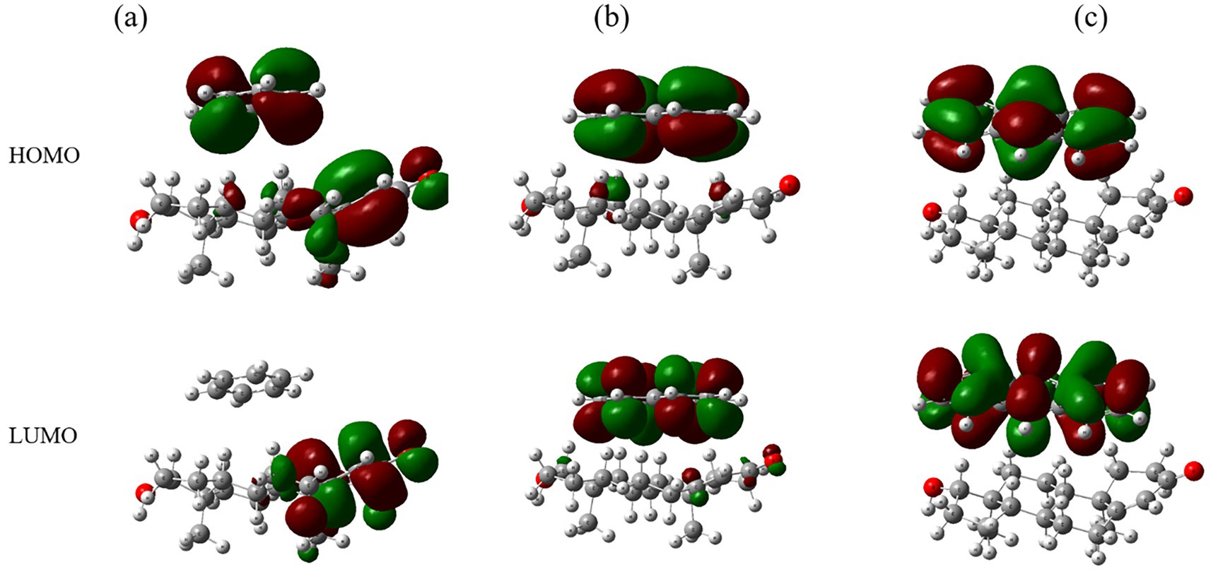 Figure 5. Molecular orbitals (HOMO and LUMO) for complexes of testosterone with (a) benzene, (b) naphthalene, and (c) anthracene.