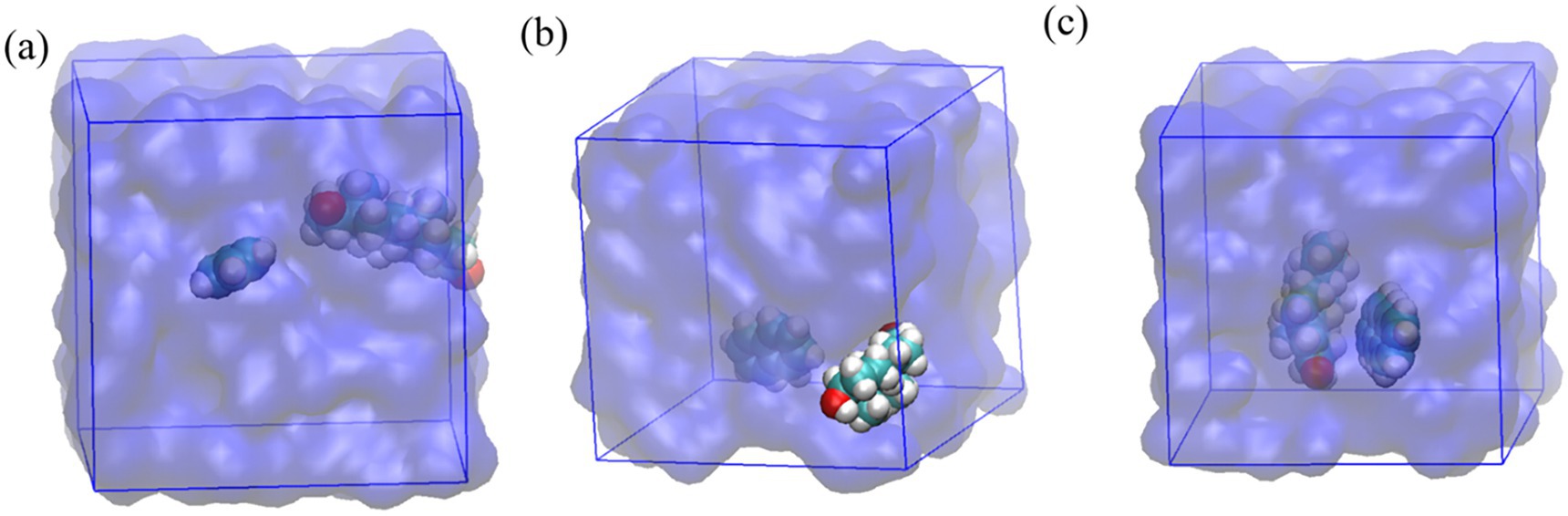 Figure 6. MD simulation snapshots of testosterone with (a) benzene, (b) naphthalene, and (c) anthracene in aqueous environments.