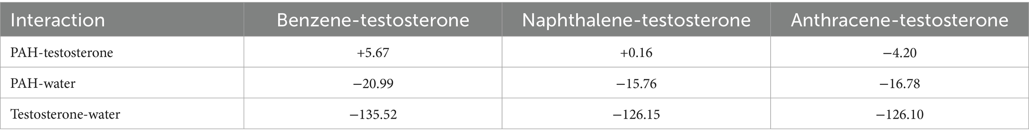 Calculated interaction energies (Table 1) quantify complex stability. Benzene-testosterone (+5.67 kJ/mol) indicates a slightly unfavorable interaction, suggesting minimal direct complexation. Naphthalene-testosterone (+0.16 kJ/mol) is nearly neutral, hinting at moderate interactions. Anthracene-testosterone (−4.20 kJ/mol) demonstrates a favorable interaction, indicating stable complex formation. PAHs exhibit varying solvation strengths (benzene −20.99 kJ/mol, naphthalene −15.76 kJ/mol, anthracene −16.78 kJ/mol), with reduced water affinity correlating with increased PAH size and enhanced testosterone affinity. These ring-number–dependent trends are consistent with prior DFT/MD reports in steroid–arene systems, where larger aromatic surfaces strengthen π–π/hydrophobic association in aqueous media; our magnitudes fall within the expected weak-association regime for non-covalent contacts and support the mechanistic plausibility inferred from MD and FMO analyses.
