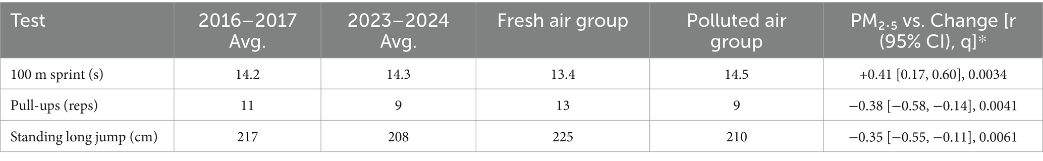 To assess exposure–response, session-averaged PM2.5 was correlated with individual change scores (see the rightmost column in Table 2). Higher PM2.5 was associated with smaller gains: 100-m sprint r = +0.41 (95% CI 0.17–0.60, q = 0.0034), pull-ups r = −0.38 (95% CI − 0.58 to −0.14, q = 0.0041), and long jump r = −0.35 (95% CI − 0.55 to −0.11, q = 0.0061). These findings were directionally consistent in sensitivity analyses (Spearman ρ; models including sleep, BMI, and adherence when available).