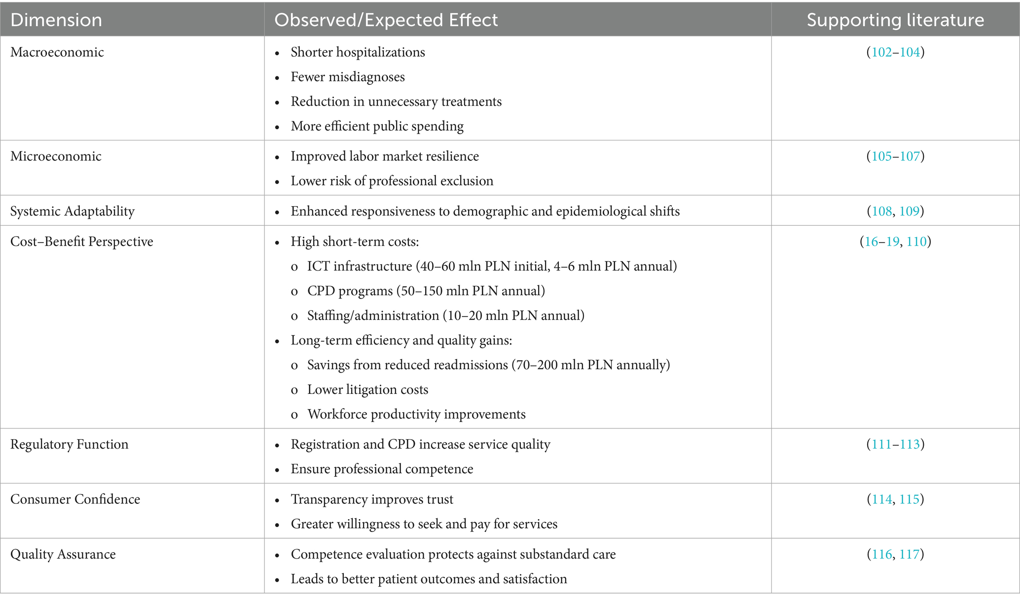 Comparative experience from OECD countries confirms this trend: in the UK, mandatory revalidation has enhanced professional accountability and patient safety monitoring, while in Sweden, large-scale public investment in CPD has improved workforce adaptability and retention. These examples indicate that the Polish reform is part of a broader international movement toward regulatory formalization, suggesting that despite initial costs, long-term benefits for both patients and health systems are likely.