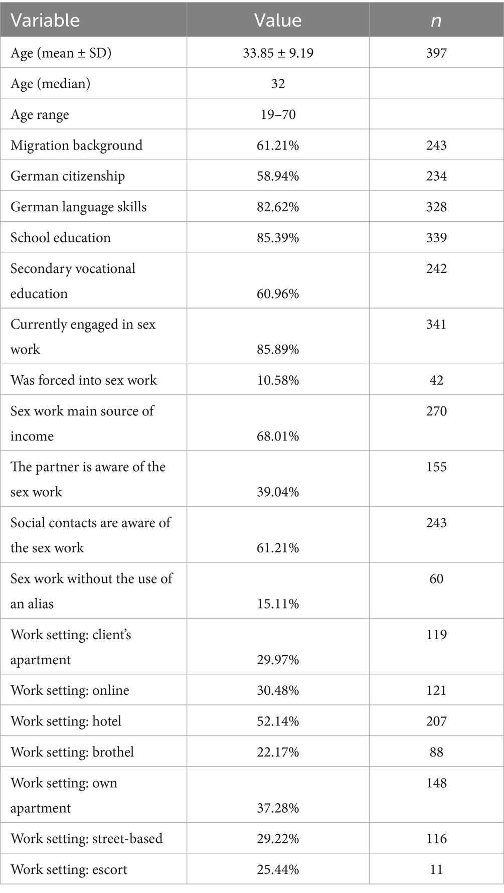 Selecting a random, probabilistic sample was infeasible due to the mostly invisible and mobile nature of the target group. Therefore, a non-proportional quota-sampling was used to ensure representation of various work settings and language proficiencies. Both independent and venue-affiliated workers were recruited. Particular attention was paid to including different “types” of sex work, such as street-based, brothel-based, escort, dominatrix, online, hotel-based, and apartment-based work. This approach ensured that the sample reflects the heterogeneity of sex work in Germany and allows for conclusions that extend beyond one occupational subgroup. Participants worked across multiple settings, reflecting the heterogeneity of sex work in Germany. Of the total sample (N = 397), 29.97% worked in clients’ apartments, 30.48% online, 52.14% in hotels, 22.17% in brothels, 37.28% in their own apartments, 29.22% in street-based contexts, and 25.44% via escort services. Percentages exceed 100% because participants could report multiple concurrent settings. Although these data appear in the Results (Table 1), we summarize them here to provide a complete description of the sample. The relative contribution of each recruitment channel was not systematically recorded. However, efforts were made to ensure a diverse and heterogeneous sample by targeting different outreach setting and sex work contexts. Participants were initially recruited through walk-in and advice centers in Berlin by distributing multilingual flyers to their clients, which informed potential participants about procedures and aims of the study. In further steps, members of various autonomous groups of sex work activists were contacted. Study employees regularly attended events organized by these groups and conducted recruitment interviews. In addition, participants were recruited at Germany’s largest annual erotic fair in 2022 and 2023. Participants were also recruited in brothels and dominatrix studios. The operators of various prostitution sites were contacted with a request for permission to conduct the study on their premises (the interviews took place in separate rooms between the participant and the study employee). Potential participants were also contacted online by study staff on various escort and community sites (such as OnlyFans). Recruitment was also carried out by contacting practicing gynecologists and psychiatric institutions with the request that they pass on the study information to eligible women. Therefore, every major occupational subtype of female sex work was represented in the final sample, providing a heterogeneous and contextually comprehensive picture of this population. However, despite these extensive recruitment efforts, it cannot but fully ruled out that certain highly hidden subgroups remain underrepresented. Because participation relied partly on outreach through service organizations and public events, women working in extreme isolation or without access to such networks may have been less likely to participate. The overall response rate could not be calculated because the number of individuals approached through different recruitment channels was not systematically recorded. This limitation reflects the open and community-based recruitment strategy used in this study, which prioritized accessibility and anonymity for participants over formal tracking of contacts.