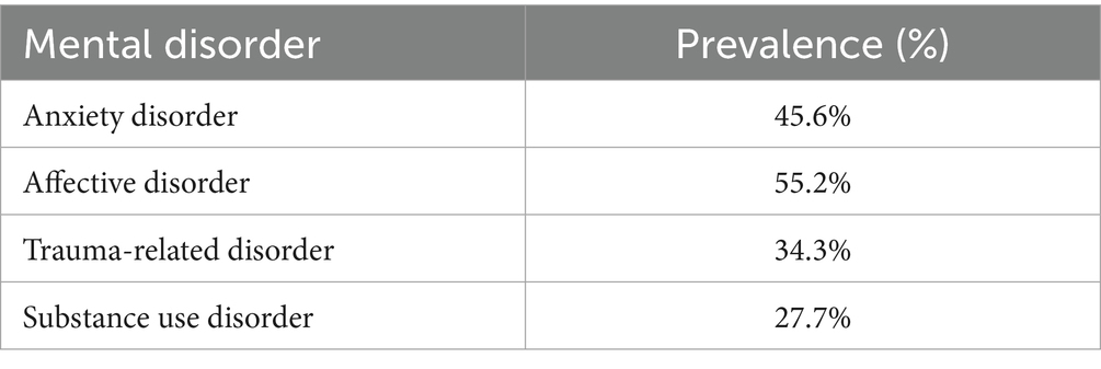 Table 2 presents the prevalence of current mental disorders, highlighting the high rates of affective, anxiety, trauma-related, and substance use disorders among female sex workers. A total of 74,6% of participants were affected by at least one mental disorder at the time, based on the conditions assessed, with the most frequently diagnosed conditions being: affective disorders (55.2%), anxiety disorders (45.6%), followed by trauma-related disorders (34.3%) and substance use disorders (27.7%) (Table 2).