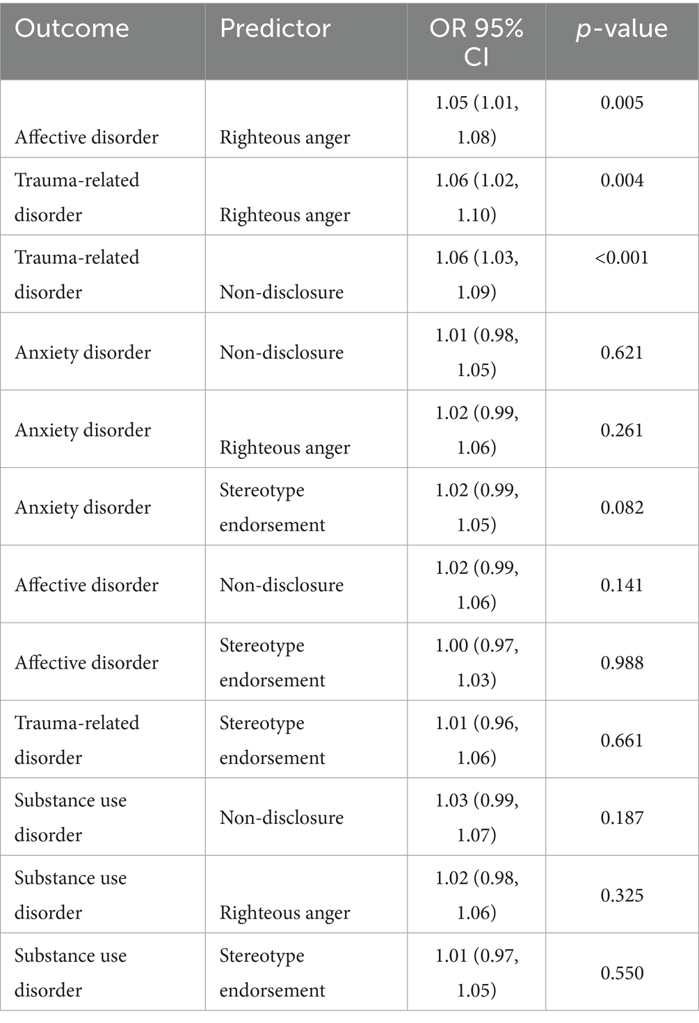 • Affective disorders were significantly associated with righteous anger [OR = 1.05, 95% CI (1.01, 1.08), p = 0.005], suggesting internalized emotional responses to stigma play a role in affective pathology.