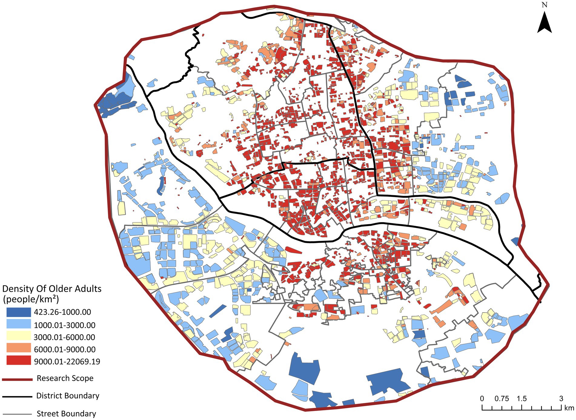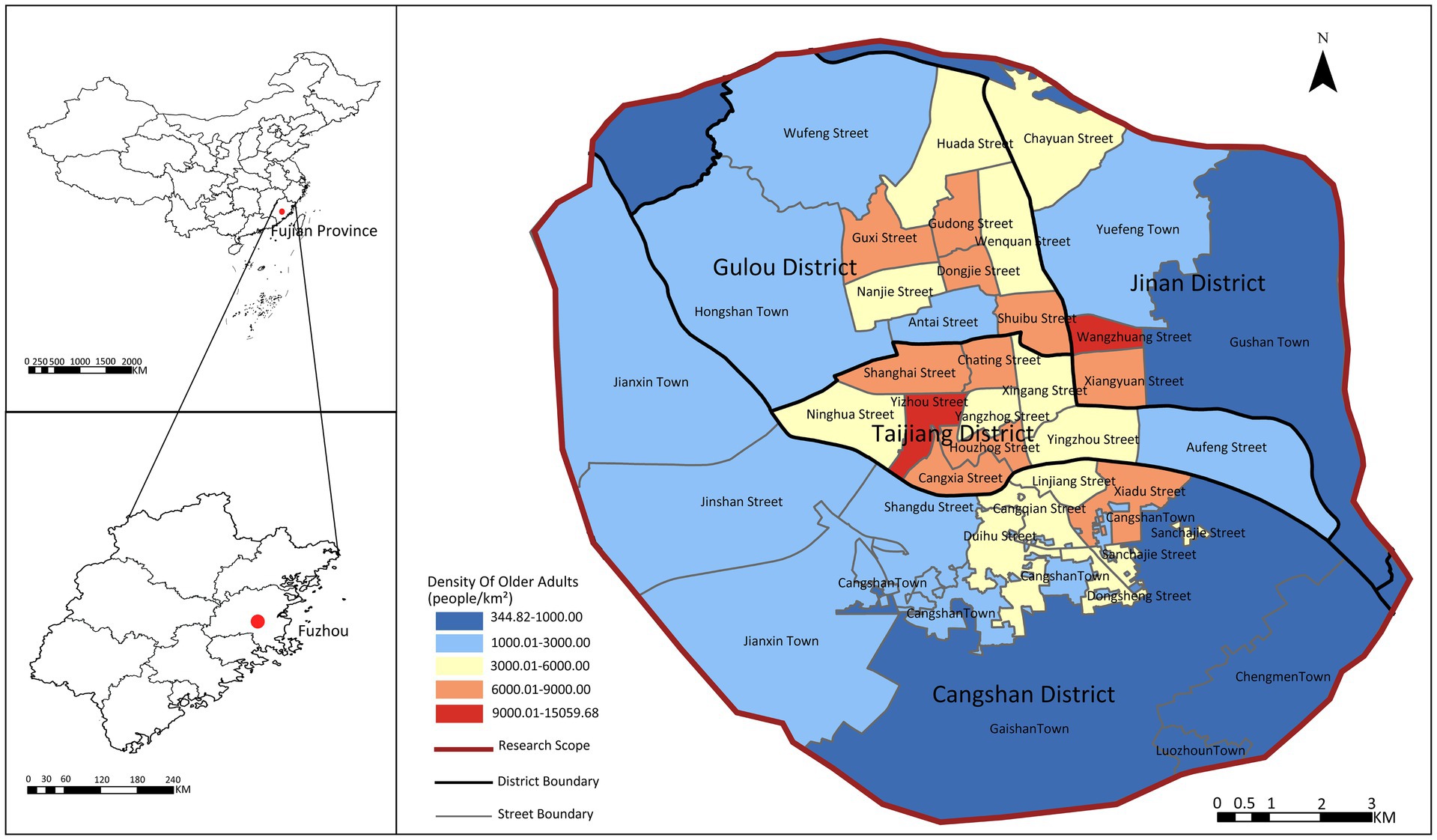 The density of the older adult population in the main urban area shows a central-edge distribution: the central urban areas of Gulou District, Taijiang District, Jin’an District, and Cangshan District have a higher density of older adult population, while the outer urban areas have a relatively lower density. This area has a well-developed urban environment and a high degree of completeness of care facilities for older adults, but the contradiction between supply and demand still exists, so the selection of Fuzhou’s main urban area is representative.