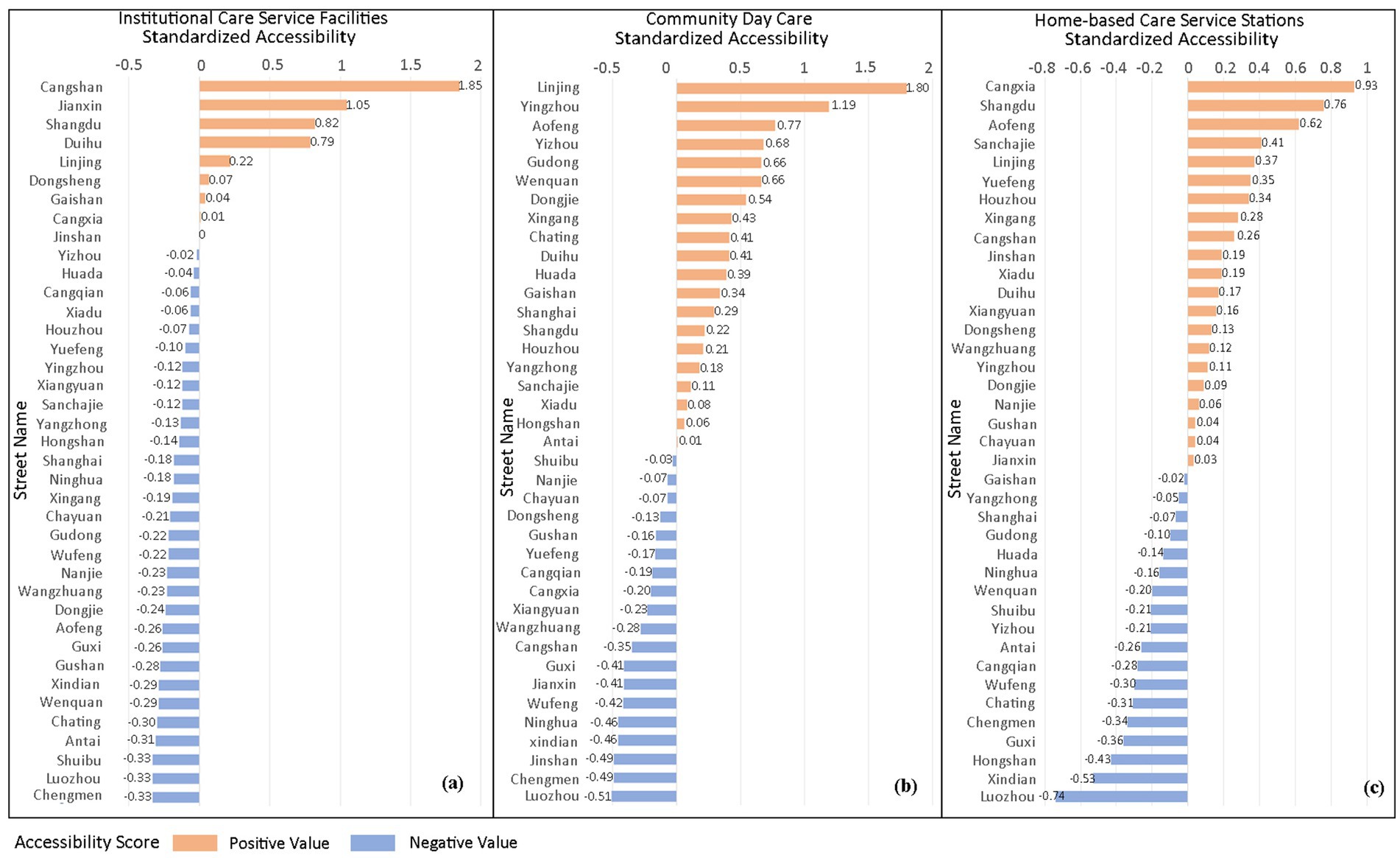 Accessibility results incorporating the older adults’ willingness weights indicate a significant mismatch between the spatial allocation of existing older adults care facilities and the actual demand structure. Therefore, taking home-based care service institutions as a starting point to improve accessibility in these areas should be a key priority in future planning.