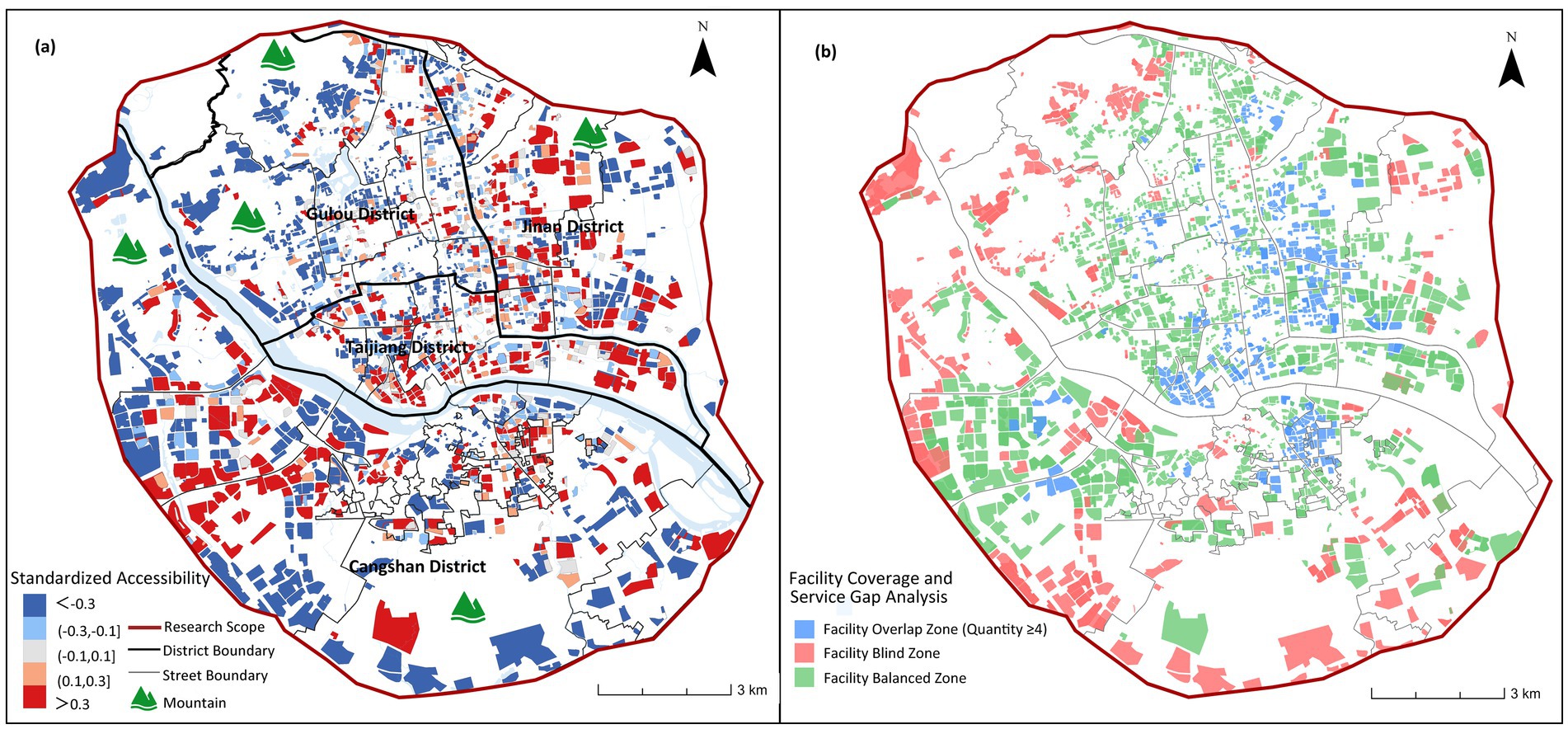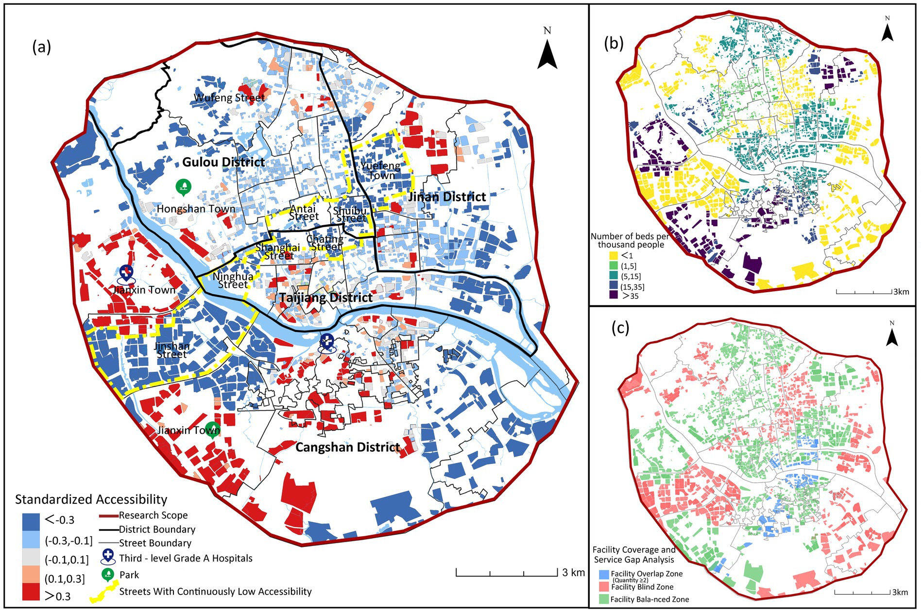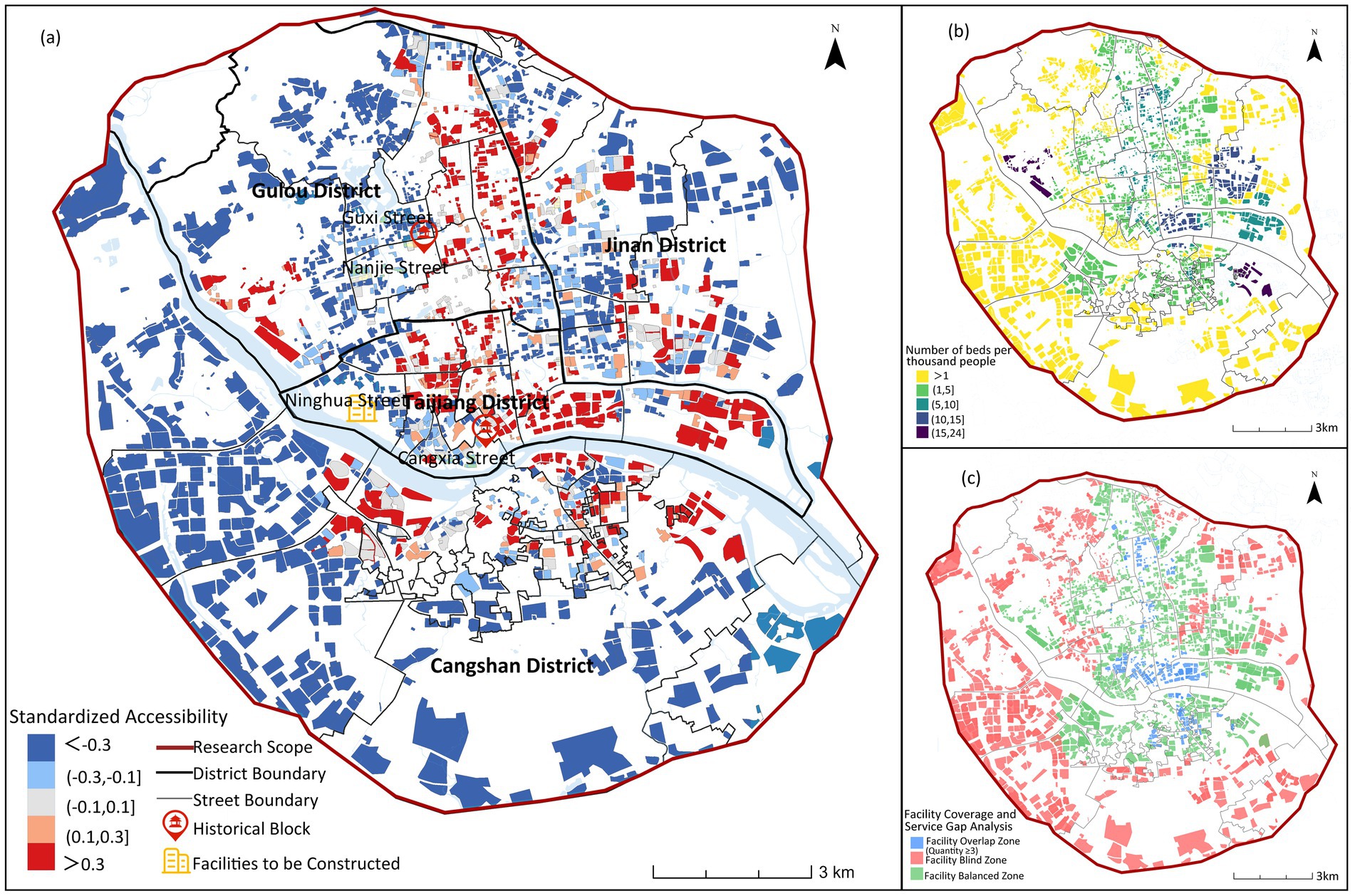 The assessment of facility-specific accessibility in this study is based on several key assumptions. First, accessibility is modeled using Euclidean distance as a proxy for travel cost, that simplifies actual travel paths but provides a consistent and replicable metric for a large-scale urban analysis (24). Second, the model assumes walking as the primary travel mode, with thresholds set accordingly. This choice is deliberate, as it aligns with the policy goal of creating walkable “15-min life circles” and establishes a conservative baseline that highlights the situation for those most dependent on proximate services, such as older adults with limited mobility. Third, the older adults population is treated as a single group in terms of travel ability within the model. It does not differentiate between subgroups with varying physical capabilities. This simplification is necessary for a macro-level spatial equity analysis but means the results represent an average potential accessibility. These foundational assumptions allow for a clear and focused evaluation of the spatial distribution of facilities relative to the older adults population, isolating this factor from the complexities of multi-modal transportation networks or individual mobility differences, which are important avenues for future research.