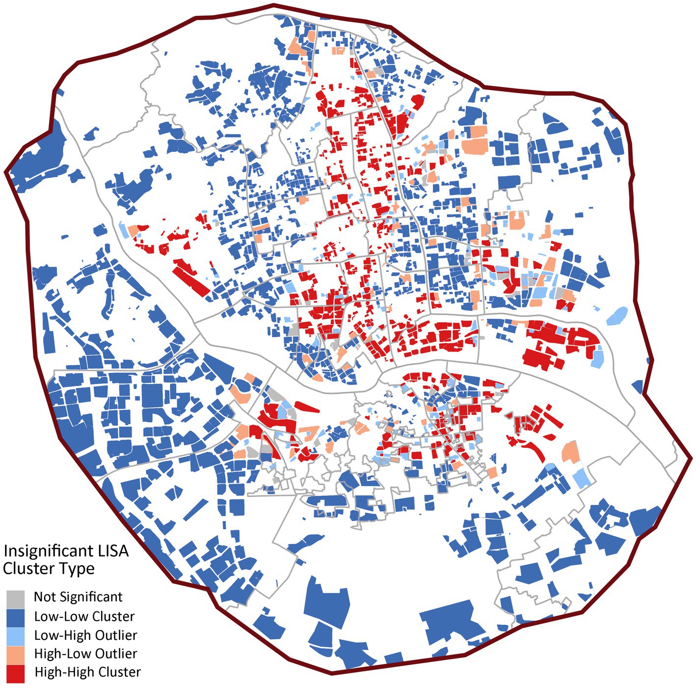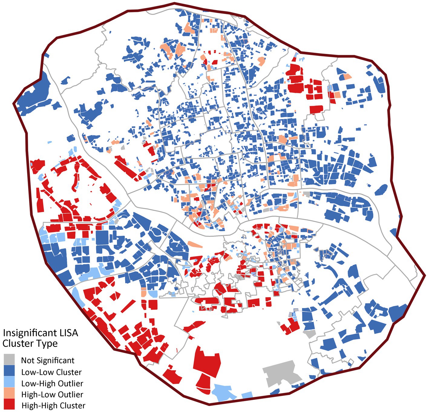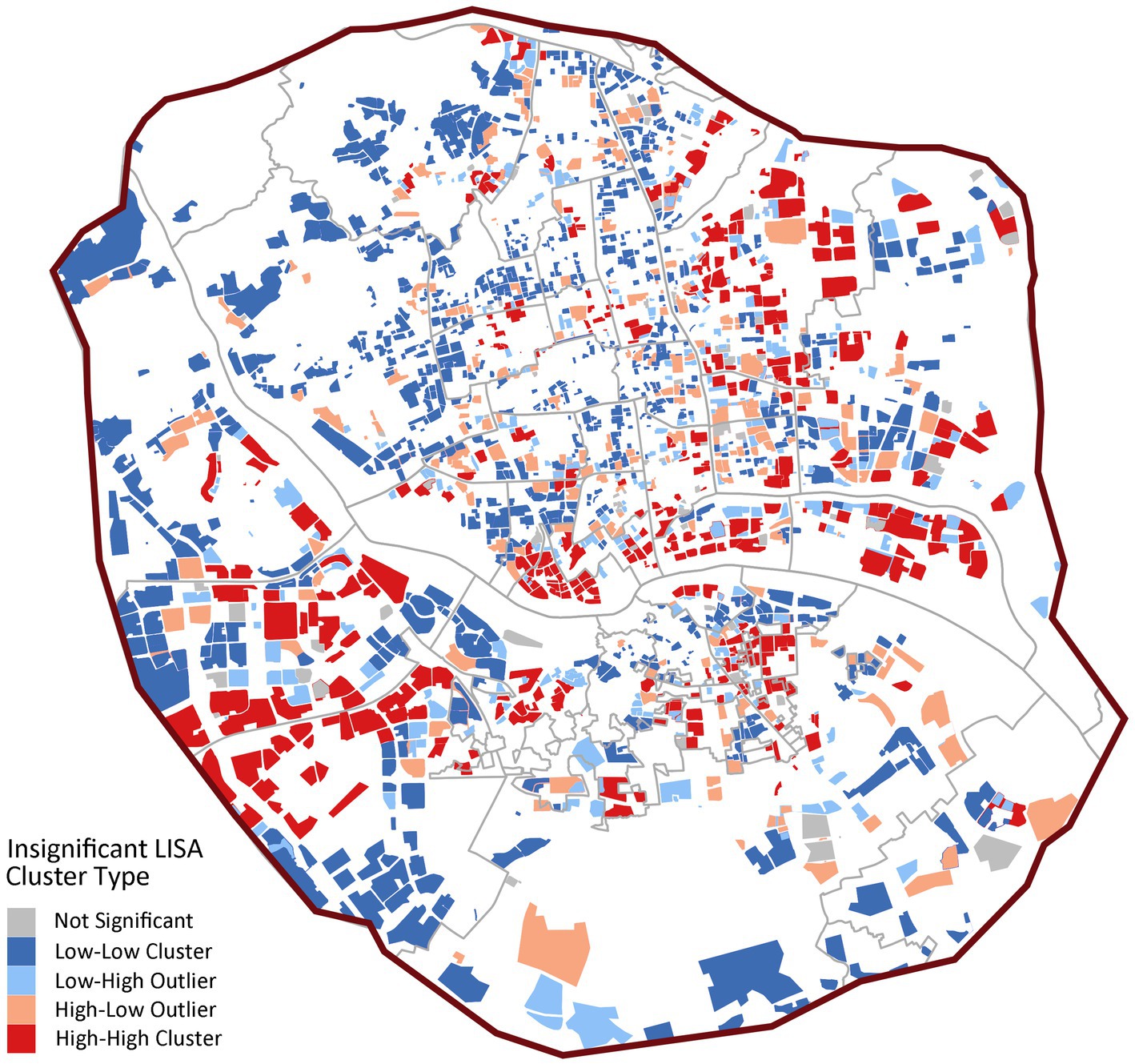 The LISA (Local Indicators of Spatial Association) analysis, based on the Local Moran’s I, classifies residential communities into five types of spatial association patterns: High-High cluster (HH), Low-Low cluster (LL), High-Low outlier (HL), Low-High outlier (LH), and Not Significant.