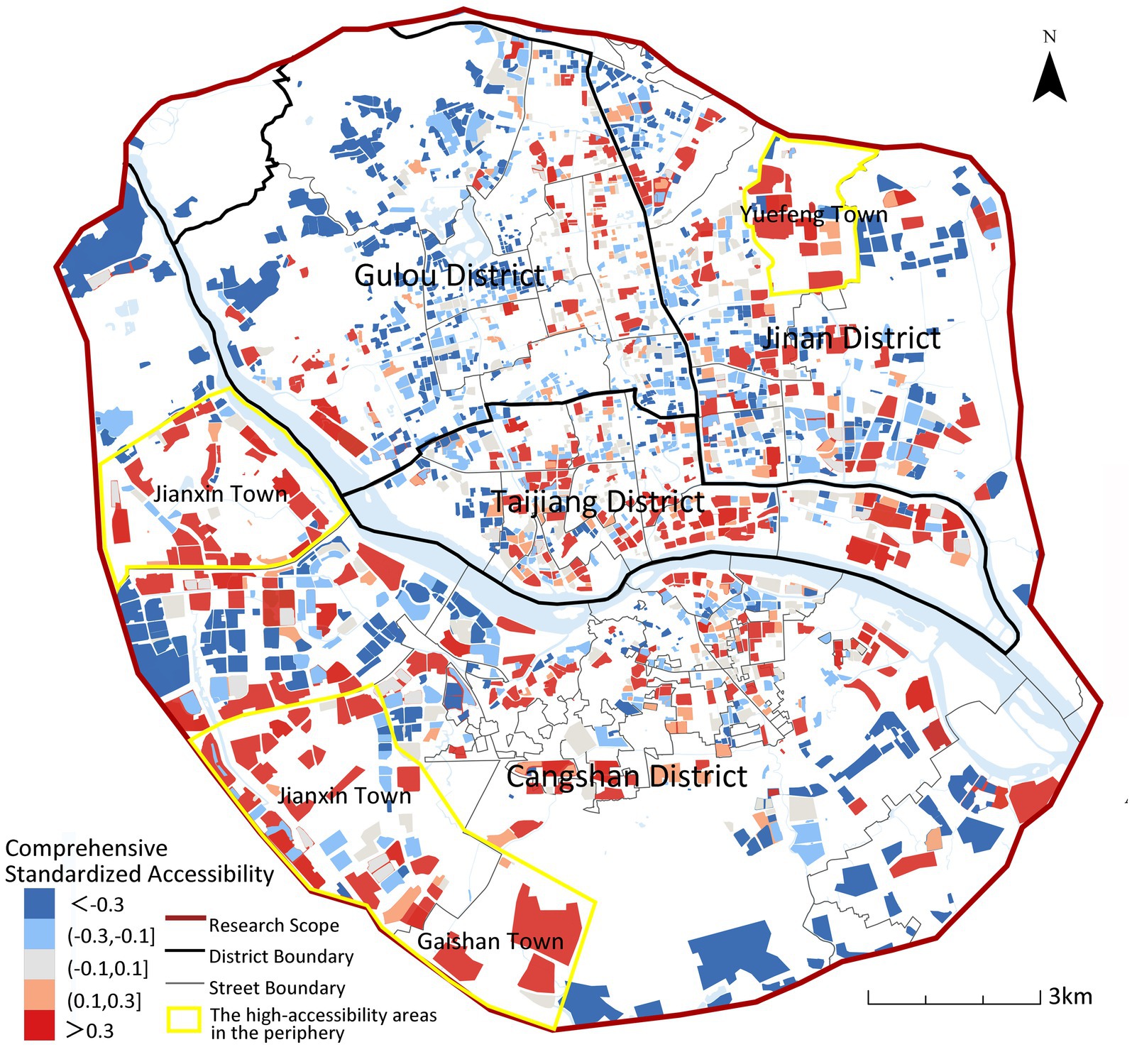 Figure 11. Composite spatial accessibility of institutional/community/home-based older adults care services across Fuzhou’s urban area.