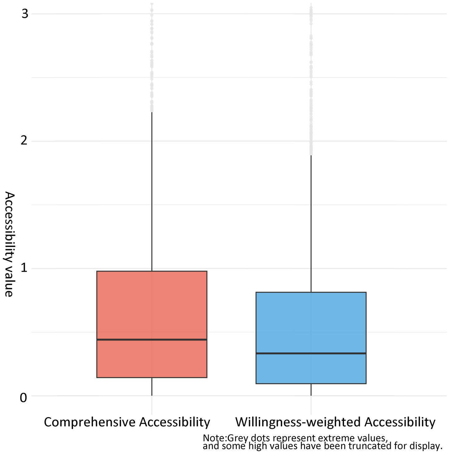 Analysis of the distribution characteristics, supported by boxplots (Figure 12) and statistical summary (Table 4), reveals fundamental differences between the two accessibility measures. The distribution of willingness-weighted accessibility shows that most communities are concentrated in the range of 0.107–0.453 (interquartile range), with a median of 0.226 and a standard deviation of 0.866, indicating relatively balanced distribution dominated by medium to low values. In contrast, comprehensive accessibility exhibits characteristics of “high-value agglomeration and extreme differentiation,” with an interquartile range of 0.141–0.792, a median of 0.358, and a substantially higher mean value of 0.948.