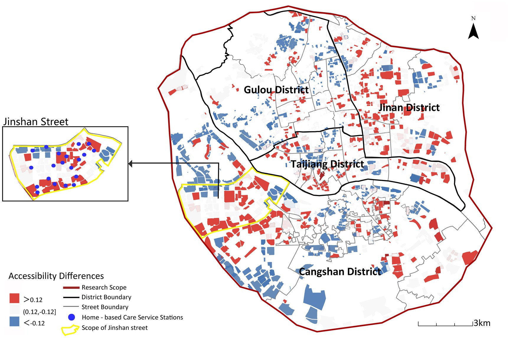 Where δ is the disparity between standardized willingness-weighted accessibility and standardized comprehensive accessibility. To eliminate the impact of random fluctuations, a threshold range of −0.12 to 0.12 is set to judge the significance of the disparity. The threshold was determined based on the quartile distribution of the δ values, where the 25th and 75th percentiles were approximately −0.137 and 0.104, respectively (32). Thus, the ±0.12 range effectively captures the middle 50% of the data as reflecting no substantive disparity. When δ >0.12, it indicates that willingness accessibility is significantly higher than comprehensive accessibility, which is mainly due to the increase in the weight of home-based care service stations to 66% leading to enhanced regional accessibility, indicating that the spatial layout of facilities better meets the preference needs of older adults. If the δ value is in the range of 0.12 to −0.12, it indicates that willingness accessibility is basically consistent with comprehensive accessibility, and the weight adjustment has no substantial impact on facility accessibility. When δ <−0.12, it shows that willingness accessibility is significantly lower than comprehensive accessibility, meaning that the spatial allocation of care facilities for older adults does not match the actual demand, especially reflecting the insufficient supply of home-based care service stations.