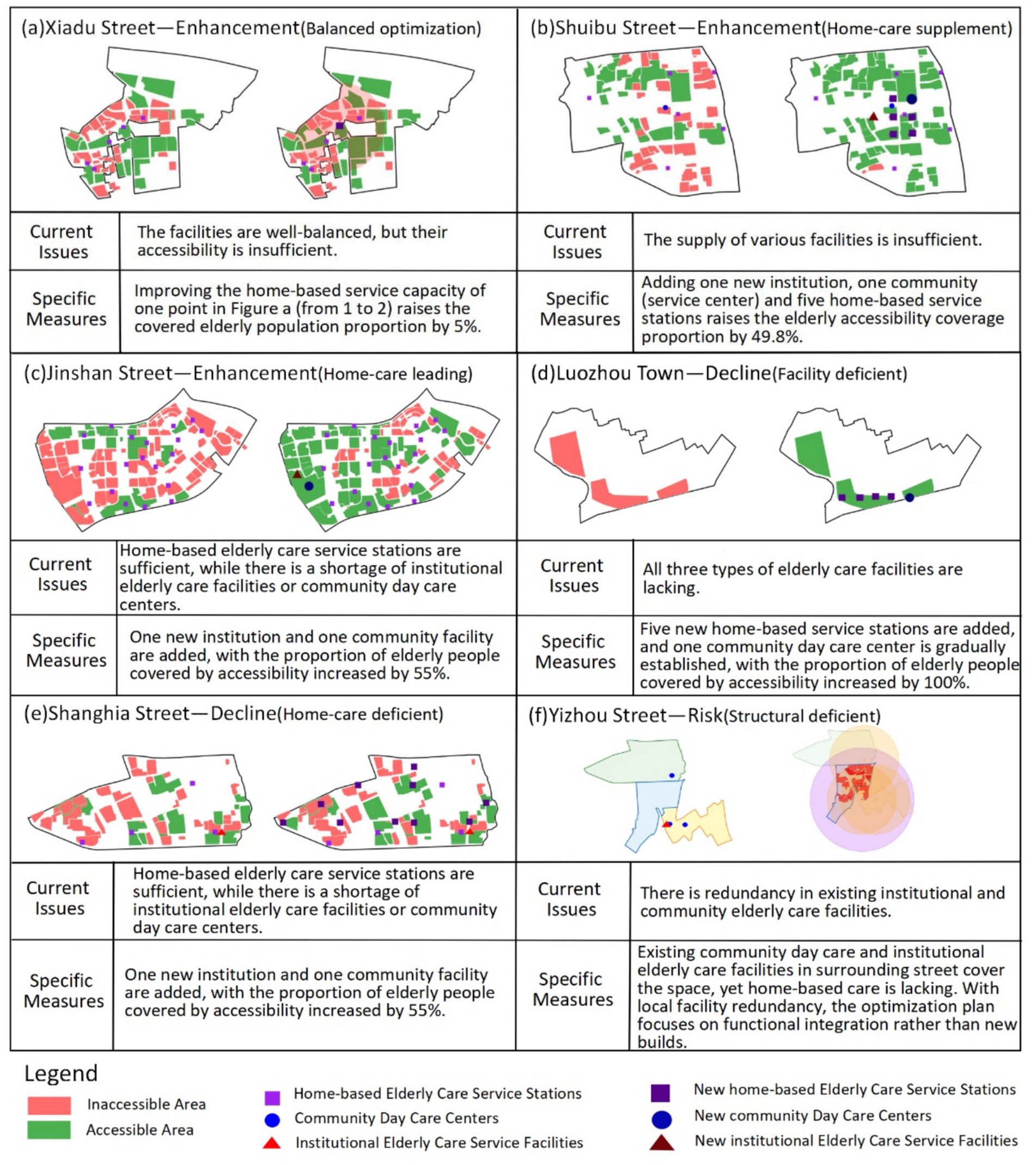 Based on the street classification (Gain, Attenuation, Risk) and accessibility characteristics, combined with older adults care preferences and facility supply–demand matching, the following targeted optimization strategies are proposed (Figures 14, 15).