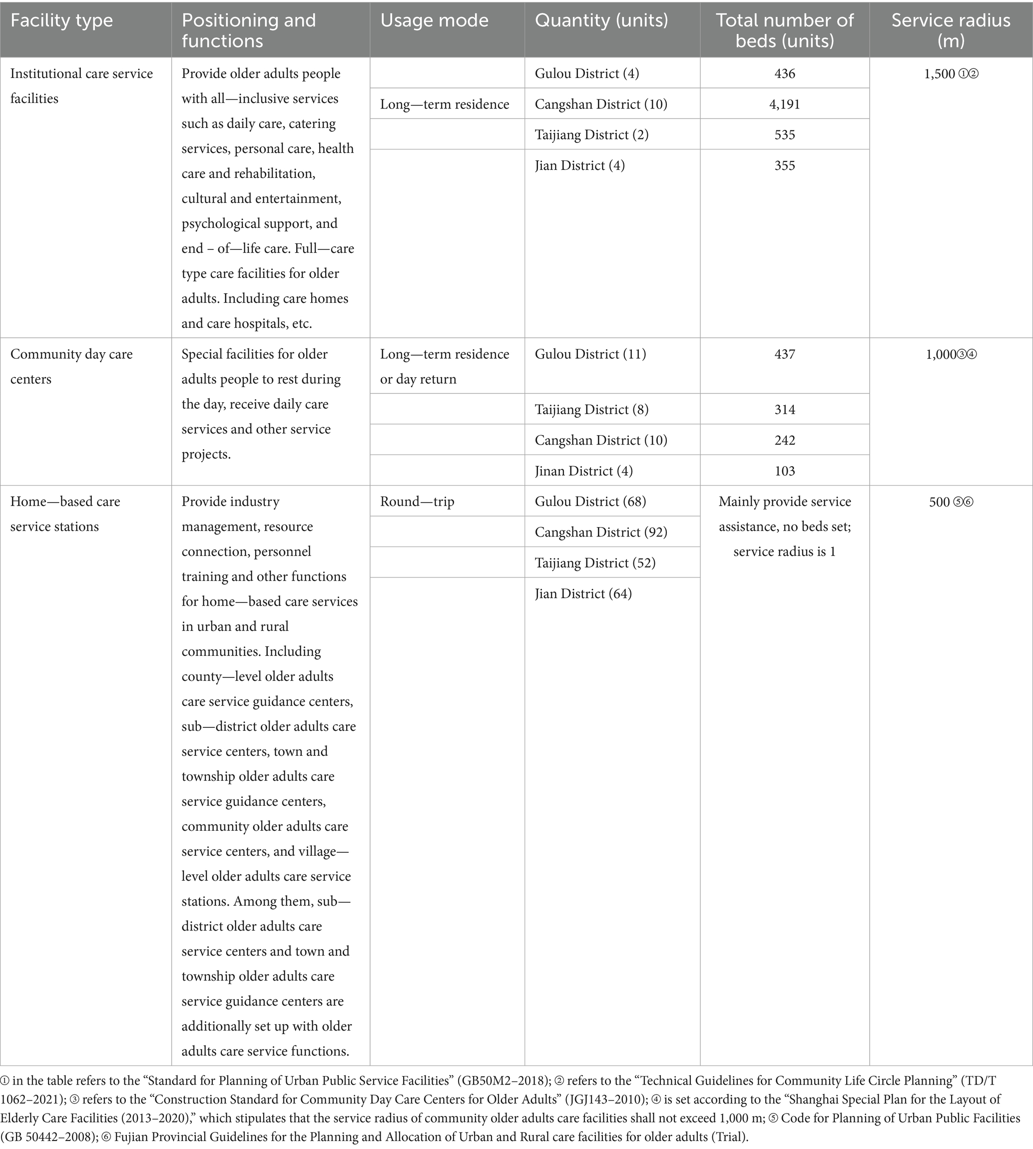 According to data released by the National Bureau of Statistics, by the end of 2024, the population aged 60 and above in China reached 310.31 million, exceeding 300 million for the first time, accounting for 22.0% of the national total population. With the shrinking of family sizes, the importance of social care for older adults has become increasingly prominent, and the demand for care facilities for older adults has grown rapidly (34). To implement the national strategy of actively responding to population aging, the “14th Five-Year Plan for National Aging Cause Development and Older Adults’ Care Service System” points out that street-level regional older adults’ care service centers and community older adults’ care service institutions should jointly build a 15-min home-based older adults’ care service circle (1). The “Fujian Provincial Older Adults’ Care Service Regulations” proposes to promote the integrated development of home-based, community, and institutional older adults’ care (2). These policies indicated that attention should be paid to the coordinated allocation of home-based, community, and institutional care service facilities, and a sound older adults’ care service facility system is an effective way to actively build an aging society in the field of planning. By the end of 2023, the number of older adults aged 60 and above in Fuzhou City reached 1.491 million, accounting for 21.66% of the city’s registered population, showing a severe situation of population aging (3).