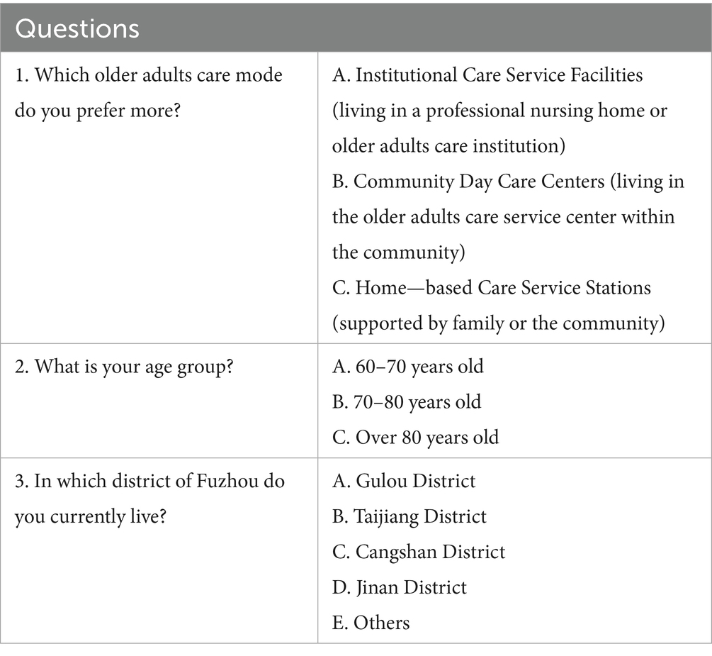 A total of 1,034 questionnaires were distributed, and 997 valid responses were collected. The questionnaire included items on the preferred older adults care mode, age group, and residential community (see Table 2). The results indicated that 658 respondents (66%) preferred home-based care service stations, 219 (22%) opted for community day care centers, and 120 (12%) chose institutional care service facilities.