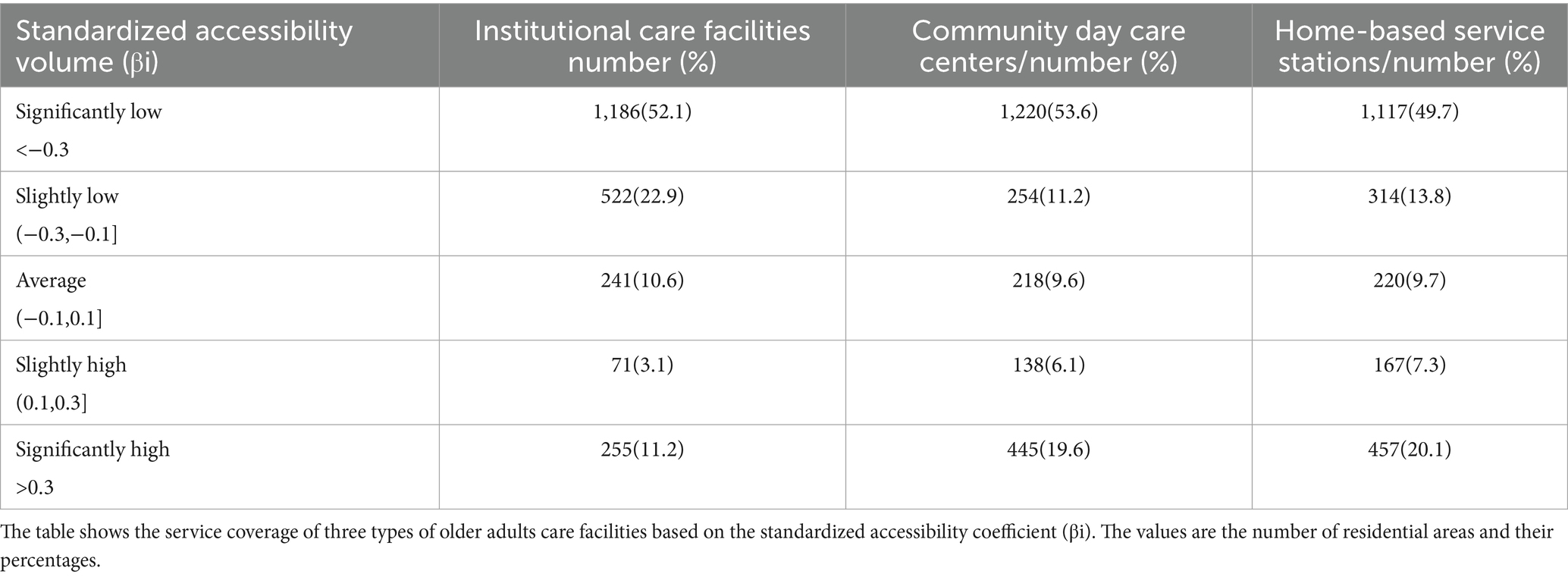 A comprehensive analysis of the three types of older adults care service facilities, based on Table 3, reveals that among the 2,275 residential communities, only 567 have accessible institutional care service facilities (βi > −0.1), accounting for 24.9% of the total. Similarly, 801 communities (35.3%) have accessible community day care centers, while 844 communities (37.1%) have accessible home-based care service stations.
