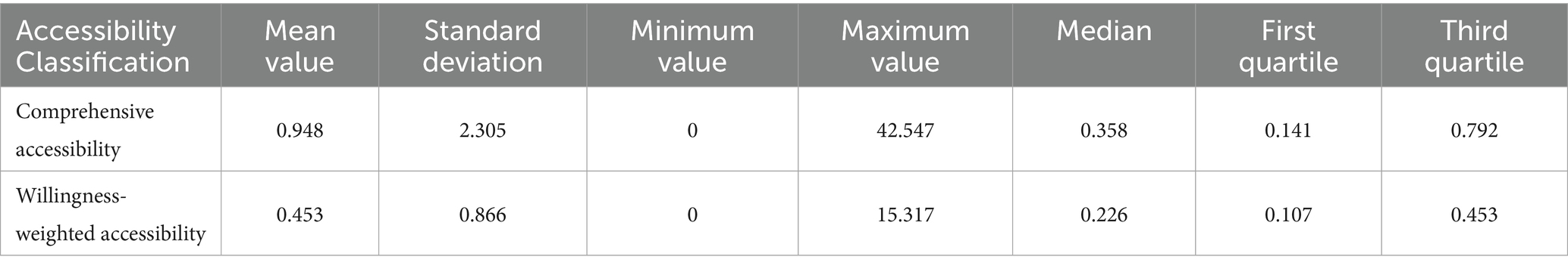 The Mann–Whitney U test was applied to quantitatively assess the disparity between comprehensive accessibility (α) and willingness-weighted accessibility (β) (35). This non-parametric test was selected because the accessibility values for each residential community violated the assumption of a normal distribution (as confirmed by a Shapiro–Wilk test, p < 0.05), thus precluding the use of parametric tests such as the paired t-test. The test was performed using the paired α and β values from all 2,275 residential communities. The null hypothesis (H₀) posited that the distributions of α and β were identical. A significant p-value (p < 0.05) would lead to the rejection of H₀, indicating a statistically significant difference between the two accessibility measures.