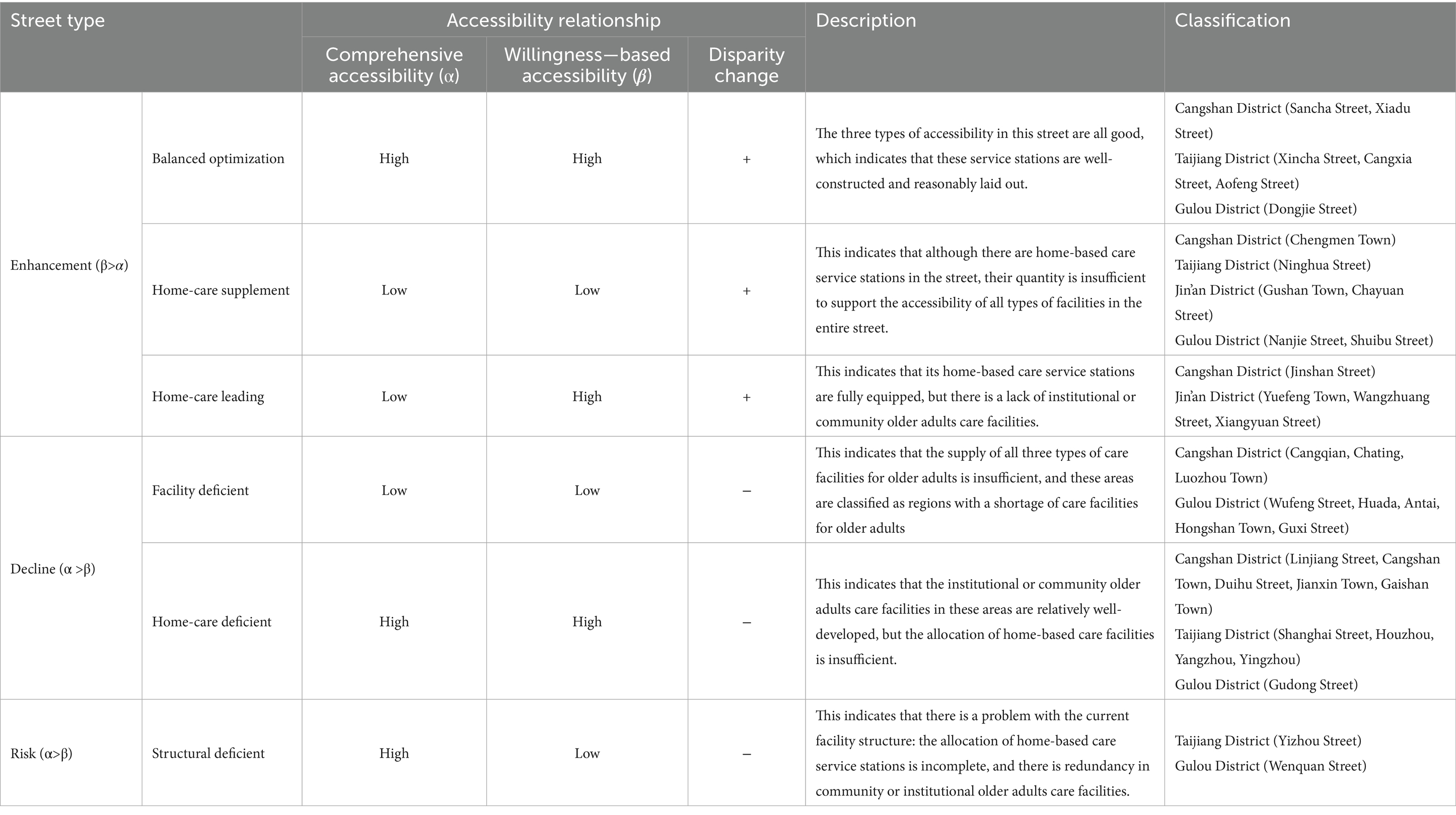 Based on the calculated disparity between willingness-weighted accessibility and comprehensive accessibility of older adults care facilities, this study identifies distinct spatial differentiation patterns between the two metrics (see Table 4).